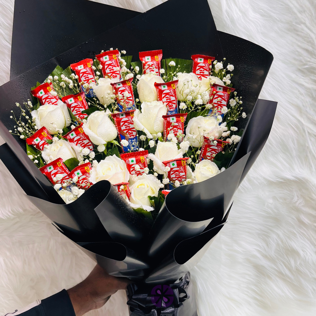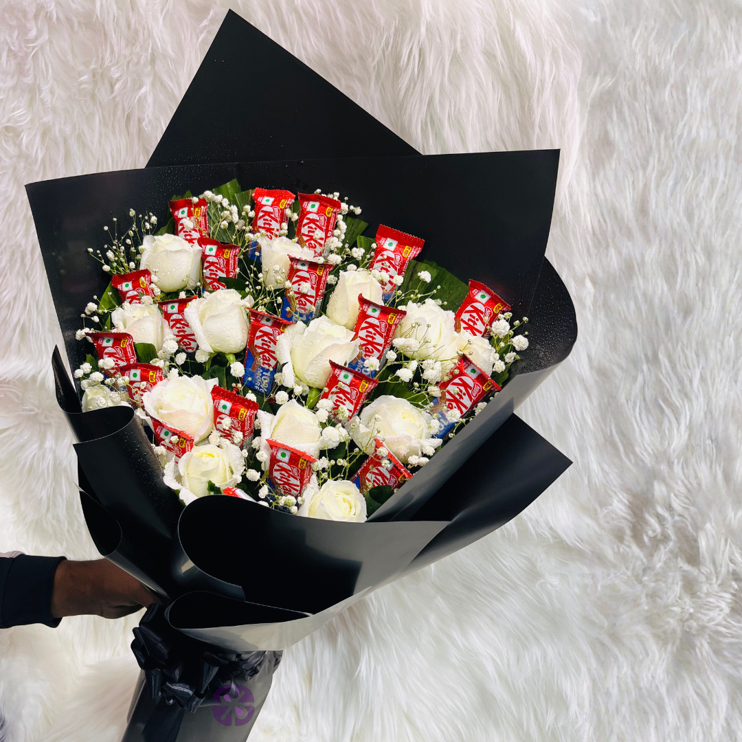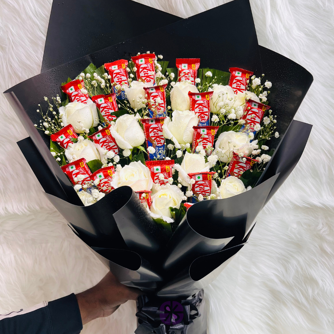 20 KitKat and White Rose Hand Bouquet in Black Wrap