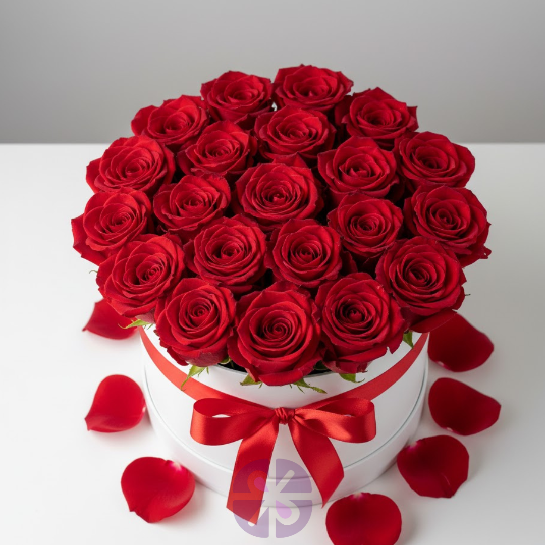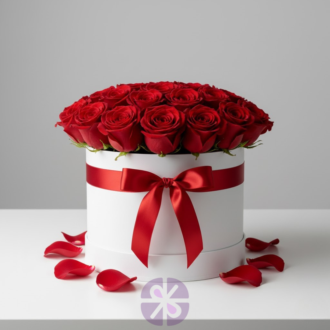 This beautiful floral arrangement is a bold, passionate display, meticulously handcrafted with approximately 35 Premium Red Roses. It is presented in a luxurious, classic white round gift box and tied with a striking red satin ribbon. This arrangement is the ultimate expression of passion, devotion, and high regard.