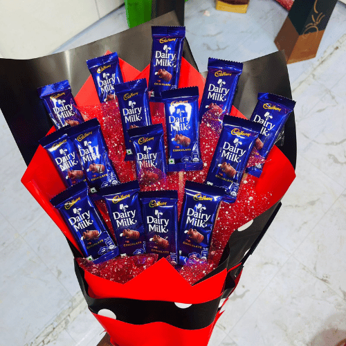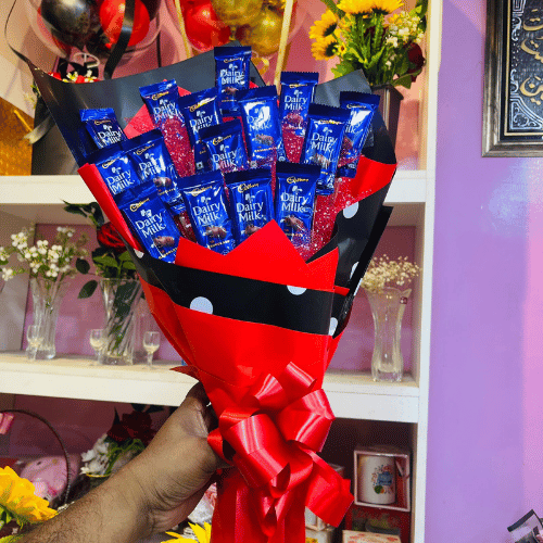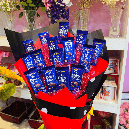 We've swapped out the blooms for something even sweeter—a generous collection of iconic Cadbury Dairy Milk chocolate bars. Each bar, with its classic smooth and creamy taste, is artfully arranged to create a stunning and edible bouquet. It’s the perfect way to satisfy a craving and deliver a huge smile.