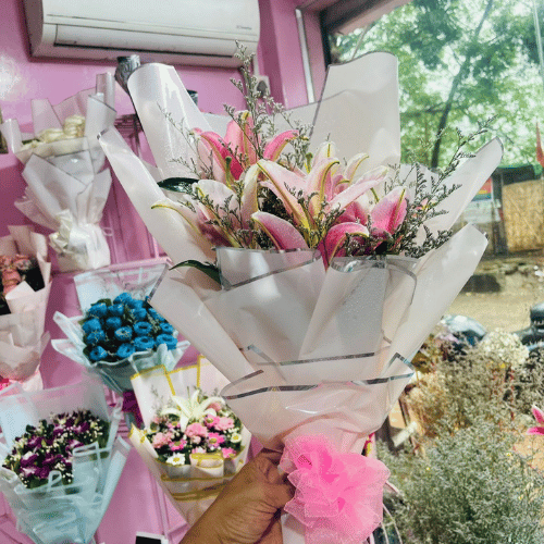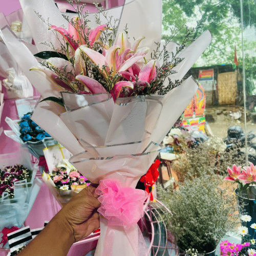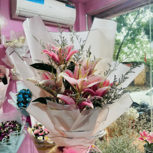 The stars of this bouquet are the magnificent pink lilies, renowned for their large, star-shaped blooms and a captivating sweet fragrance that will fill the room. Each lily is a symbol of prosperity, abundance, and heartfelt admiration, making this the perfect gift to honor and celebrate the incredible people in your life.