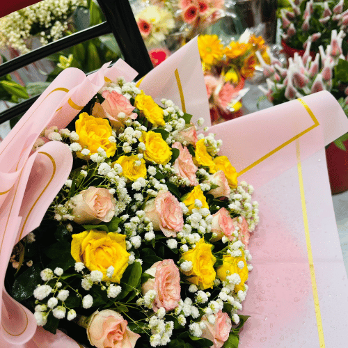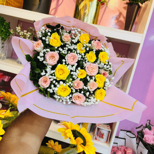 This beautiful bouquet features a delightful mix of sunny yellow and sweet pink spray roses. The yellow roses burst with the energy of friendship and happiness, while the gentle pink roses whisper messages of admiration and gratitude. Together, they create a perfect harmony of warm feelings, ideal for a cherished friend, a supportive colleague, or a beloved family member.
