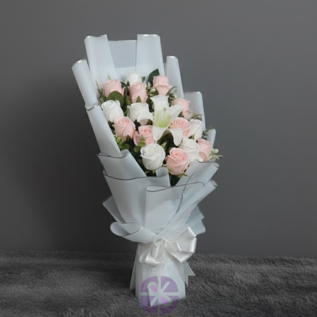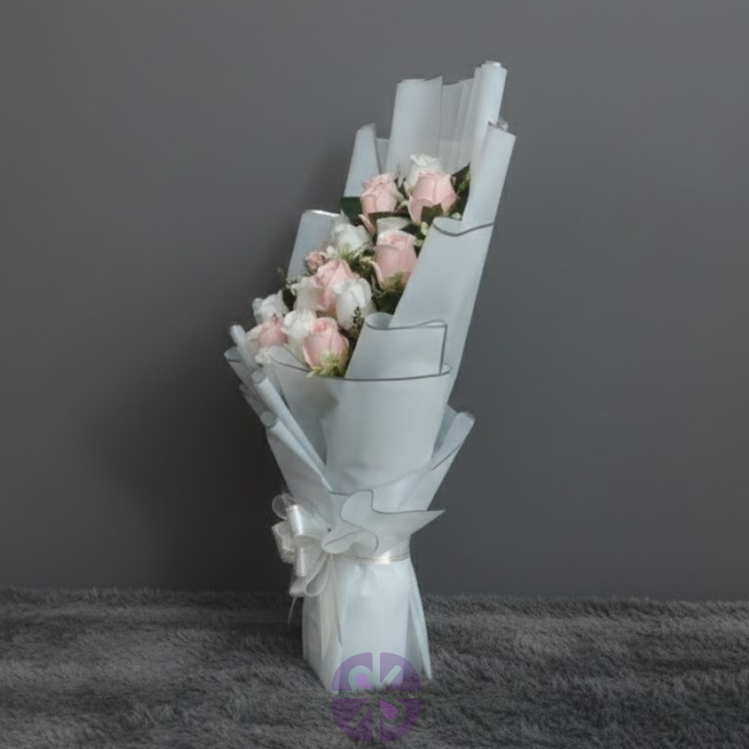 It will be instantly captivated because this arrangement offers permanent, luxurious beauty in a dramatic 'Stand Bouquet' style. This is an artificial silk flower arrangement, designed to be an enduring keepsake that requires no water or maintenance. It features an elegant blend of soft Pink Roses and Pure White Roses, perfectly presented to ensure a high-impact, prestigious display that lasts forever.