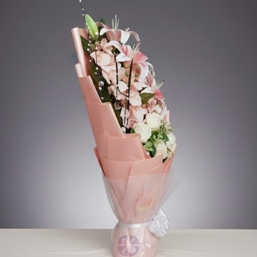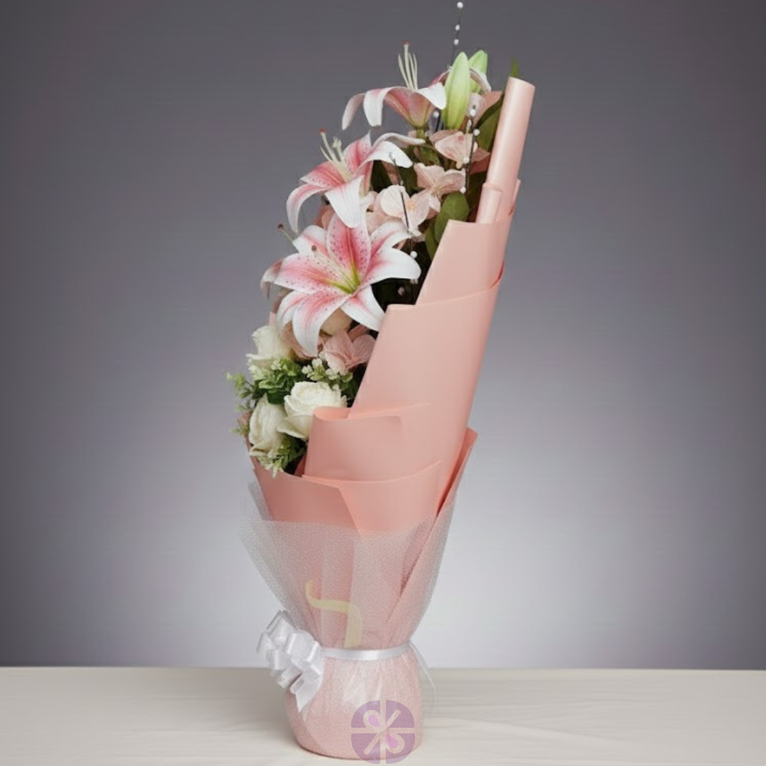This stunning arrangement instantly captivates with its complexity and depth of design. It features an opulent blend of Pure White Roses (symbolizing reverence), stunning Pink Lilies (representing affection), subtle Orchid-style blooms, and modern fillers like Eucalyptus. The key advantage of this bouquet is its durability and zero maintenance: this sophisticated artificial piece never fades, requires no water, and remains a perfect, elaborate focal point or cherished, lasting gift forever. The combination of large feature flowers with trendy greenery ensures a premium, high-impact presentation that is ideal for any luxurious setting or permanent collection.