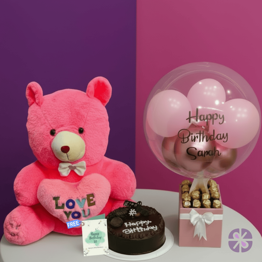 Birthday Joy Teddy Bear, Cake & Balloon Bouquet Combo Set