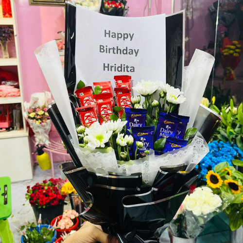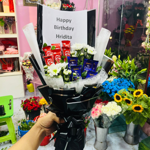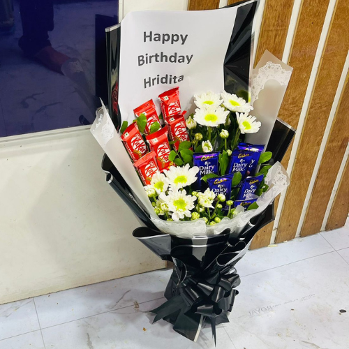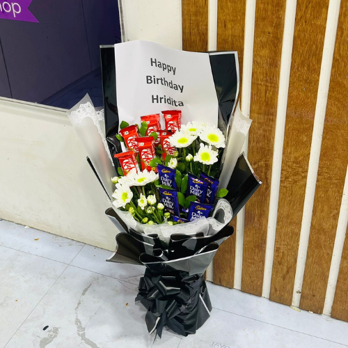 Black Wrapped Birthday Bouquet with KitKat, Dairy Milk & White Chrysanthemums