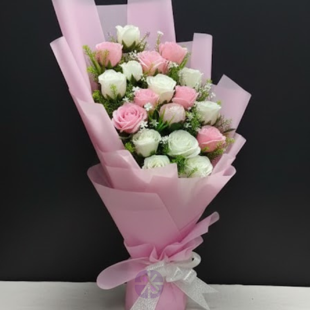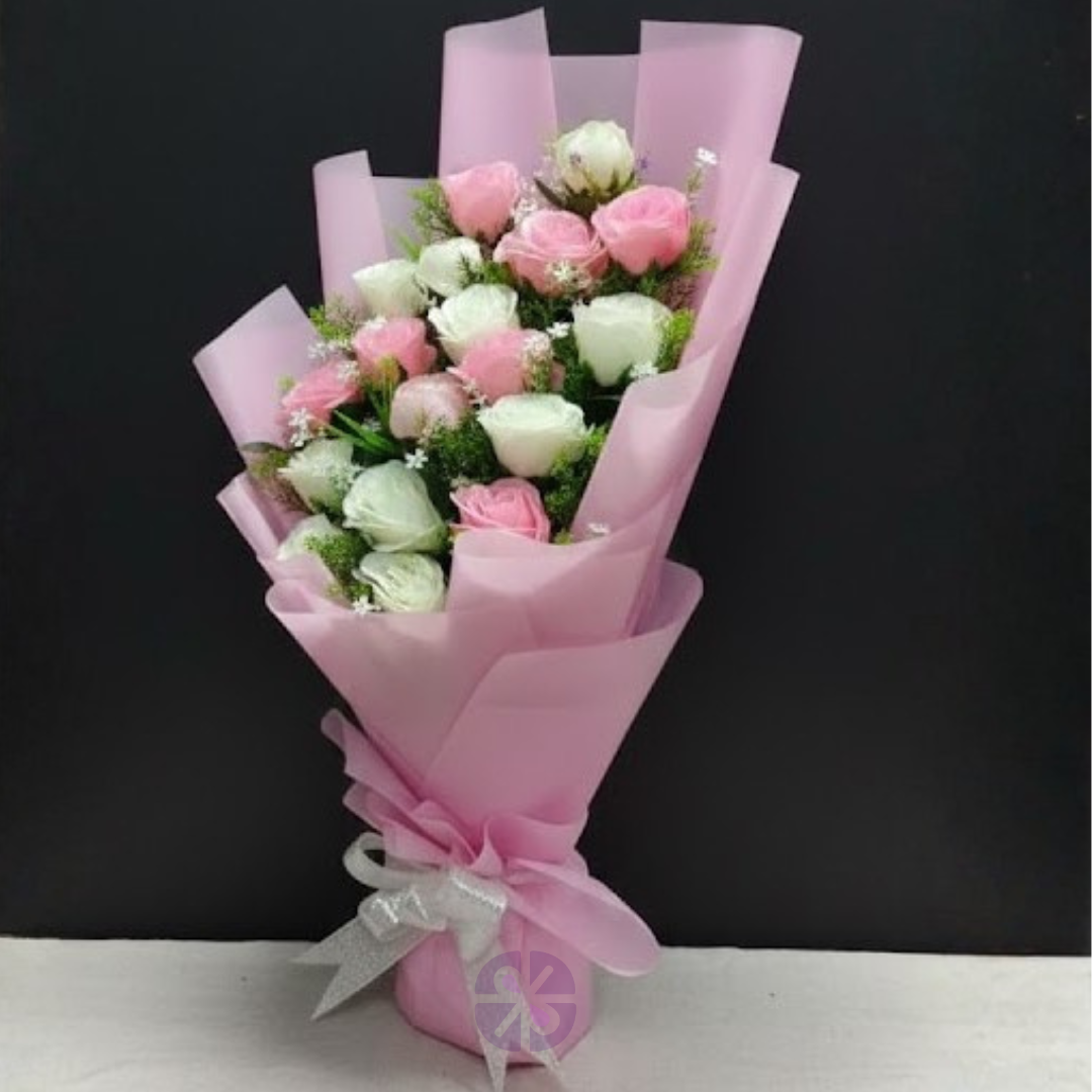 This arrangement features a generous mix of pure White Roses (symbolizing sincerity and purity) and romantic Pink Roses (grace, happiness, and admiration), creating a visually harmonious composition. The soft pink wrapping enhances the romantic and tender appeal of the blooms. The key advantage of this bouquet is its durability and zero maintenance: this sophisticated artificial piece never fades, requires no water, and remains a perfect, pristine decorative item or long-lasting, cherished gift forever. It is an ideal, stress-free gift solution that ensures lasting elegance for anniversaries, birthdays, or Valentine's Day.