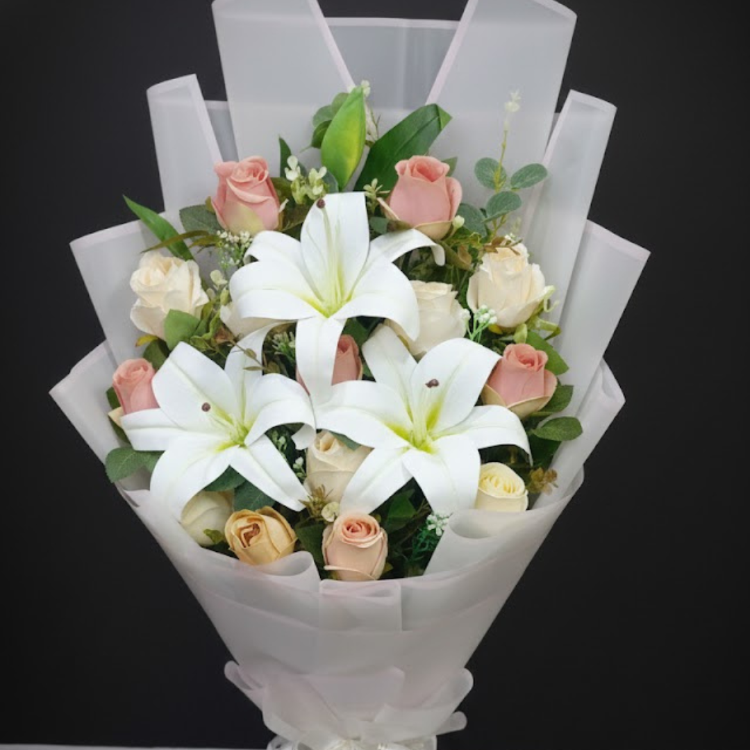 It features magnificent White Lilies (symbolizing purity and majesty) nestled among a lush mix of White Roses (sincerity) and Shade Pink/Light Peach Roses (grace and admiration). The combination of the large lilies and the multi-shade roses creates a visually appealing and sophisticated contrast. The key advantage of this bouquet is its durability and zero maintenance: this artificial piece never wilts, requires no water, and remains a perfect, pristine decorative item or long-lasting, cherished gift forever. It is an ideal, stress-free gift solution that ensures lasting beauty for any occasion.