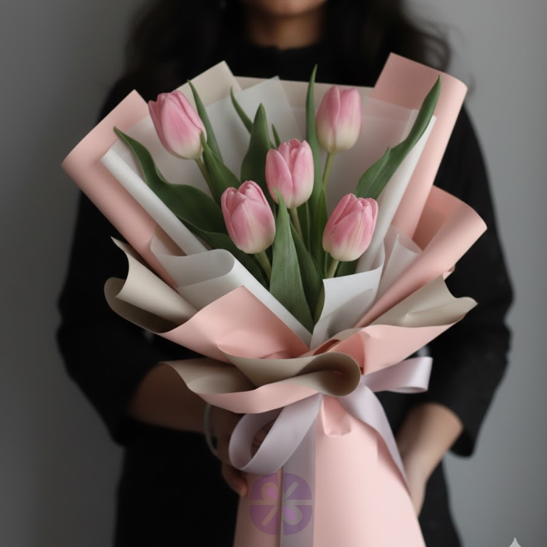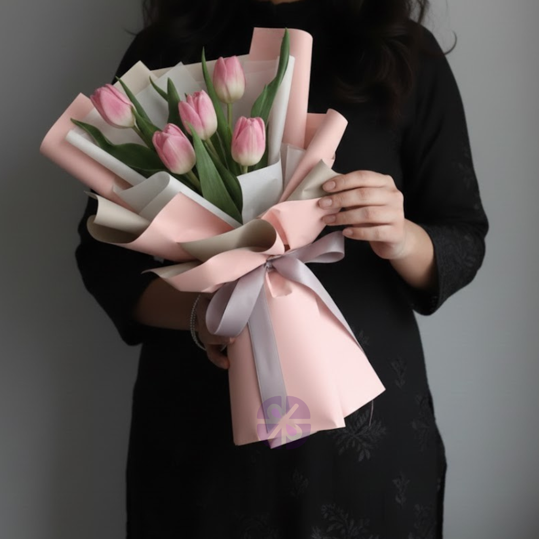 This beautiful artificial flower arrangement is a minimalist, fresh, and modern display, expertly crafted from high-quality silk to ensure permanent and realistic elegance. It is presented as a stylish Hand Bouquet, featuring soft pink tulip blooms elegantly wrapped in Pastel Pink Paper.