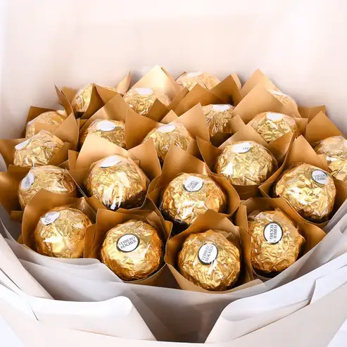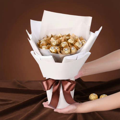 Understated Elegance: Wrapped in serene white paper and tied with a rich chocolate-brown ribbon, this bouquet signifies pure sophistication. The golden glow of the treats inside brightens any occasion.