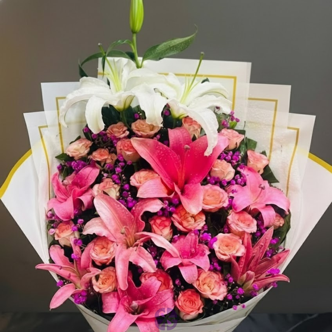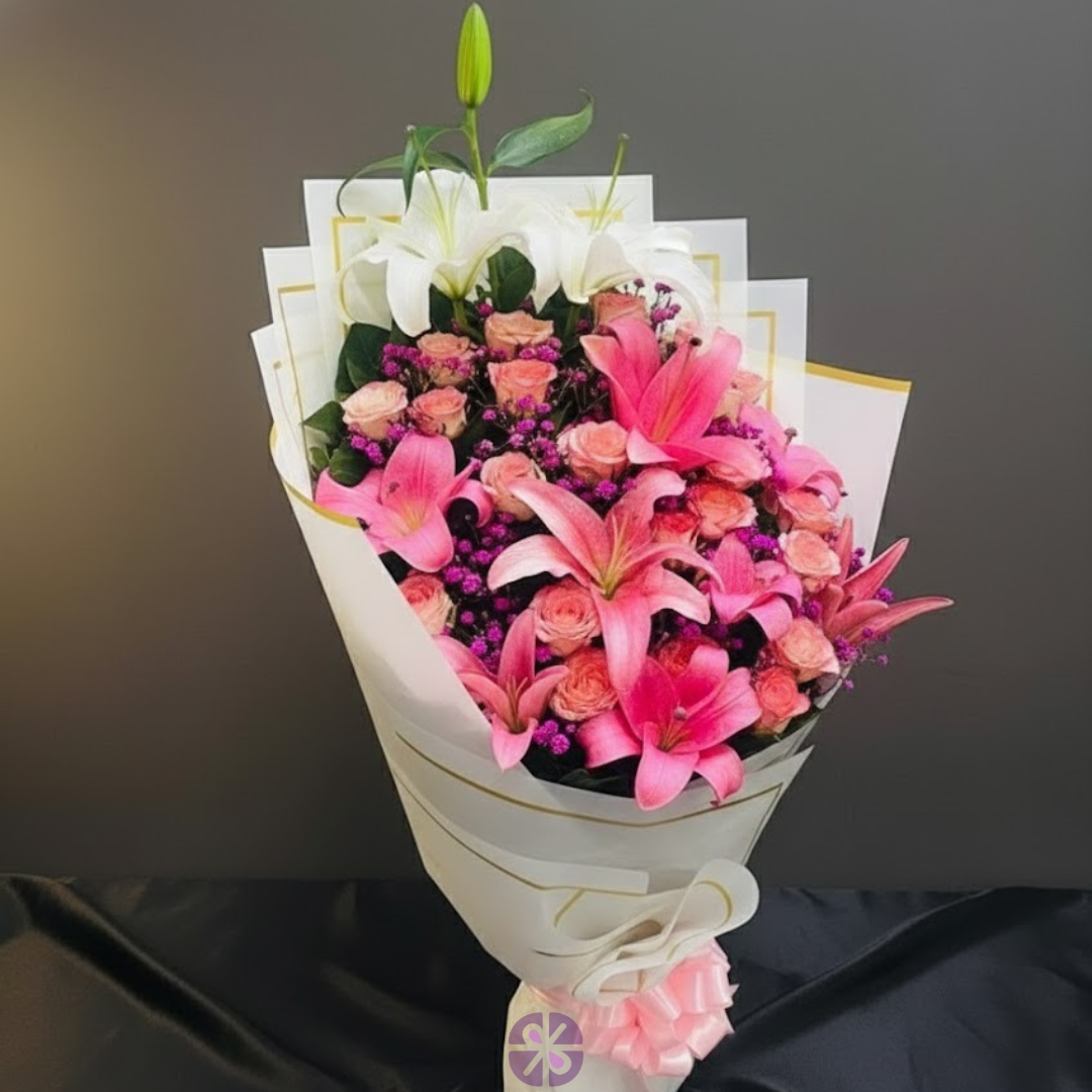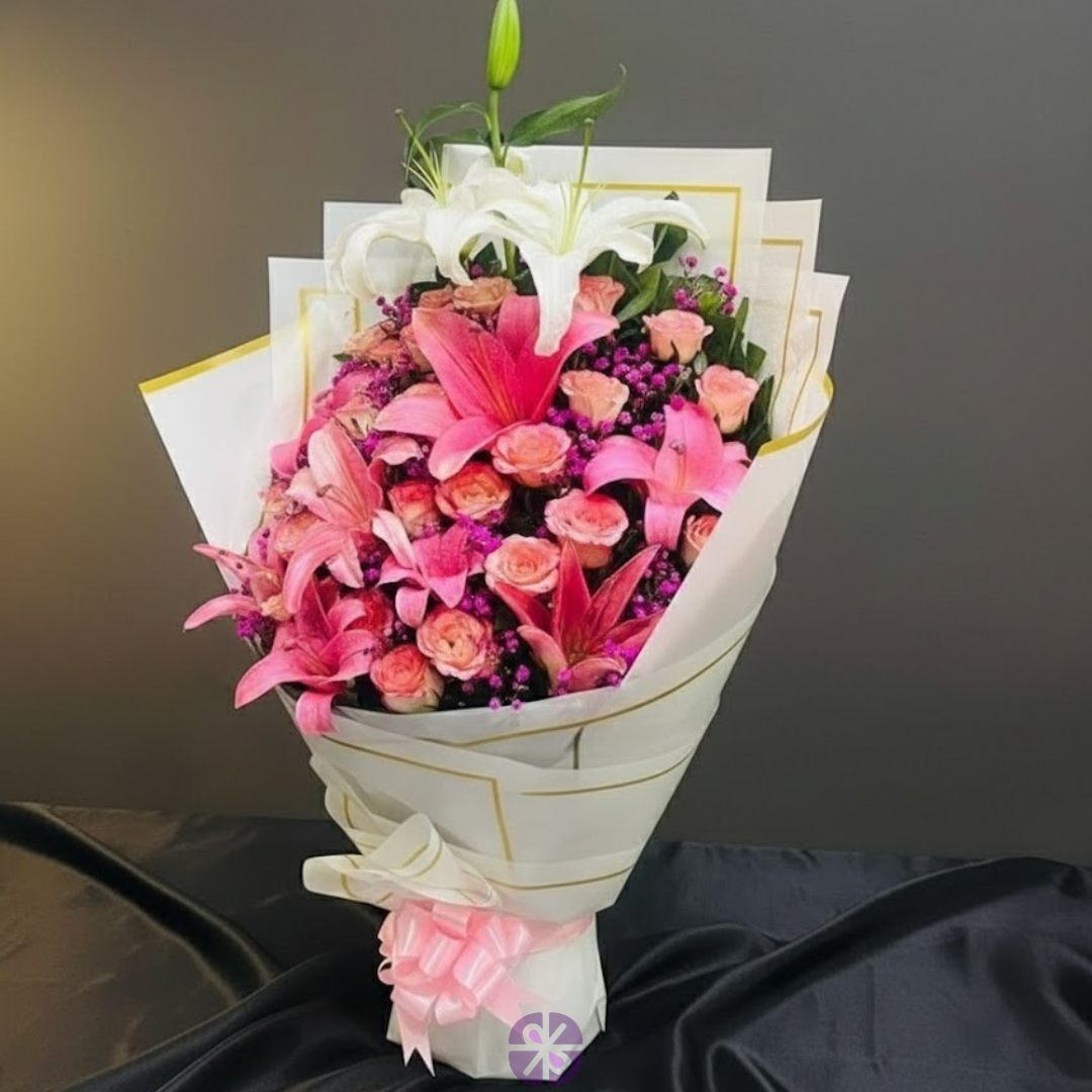 Elegant Pink & White Lily Stand Bouquet with Soft Pink Rose Accents