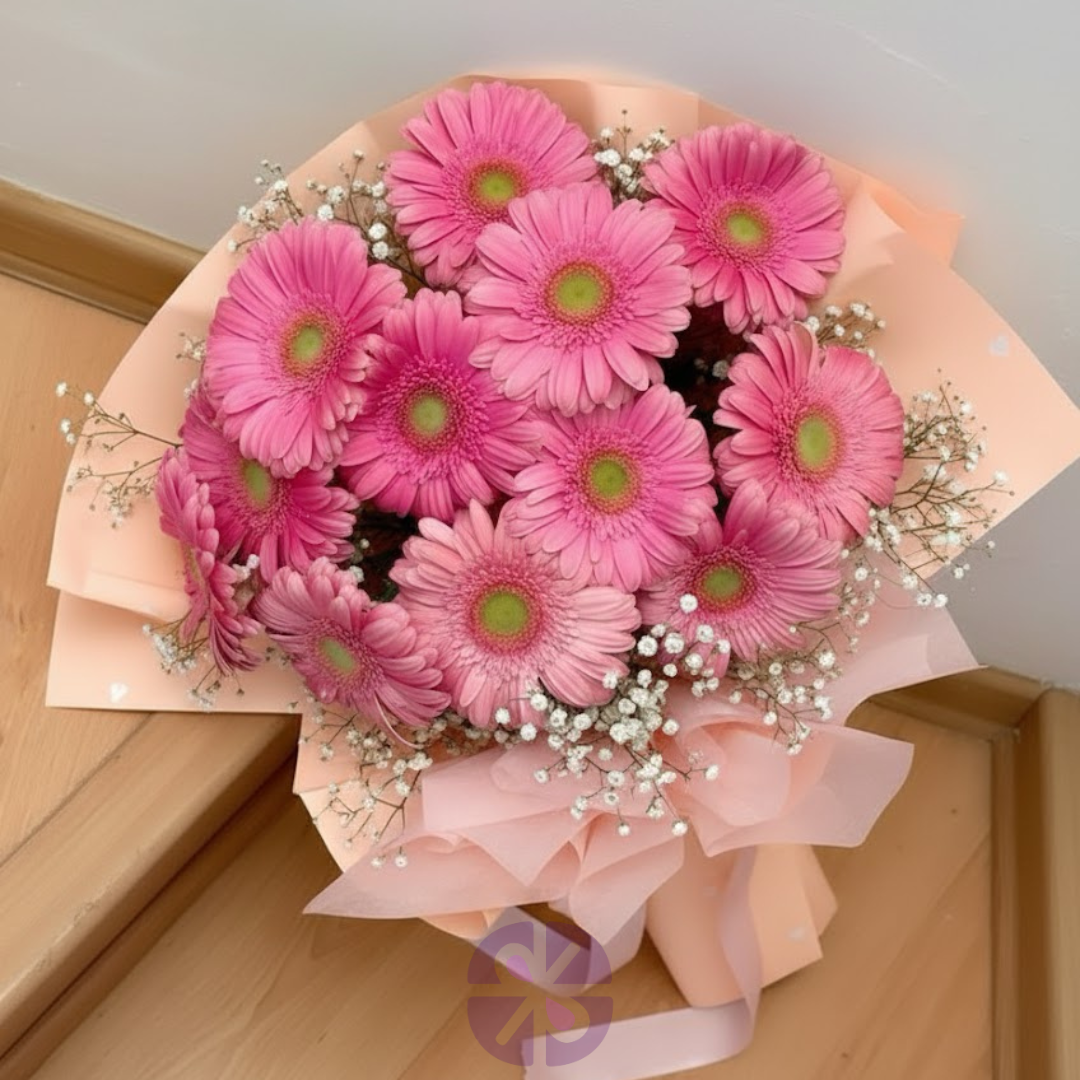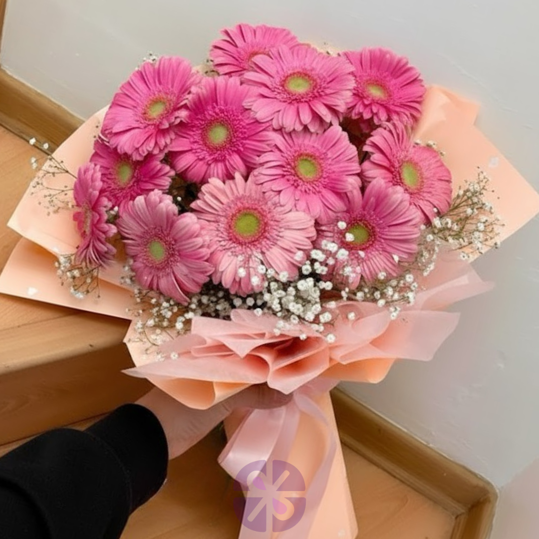 Elegent 12 Pink Gerbera and Baby's Breath Hand Bouquet