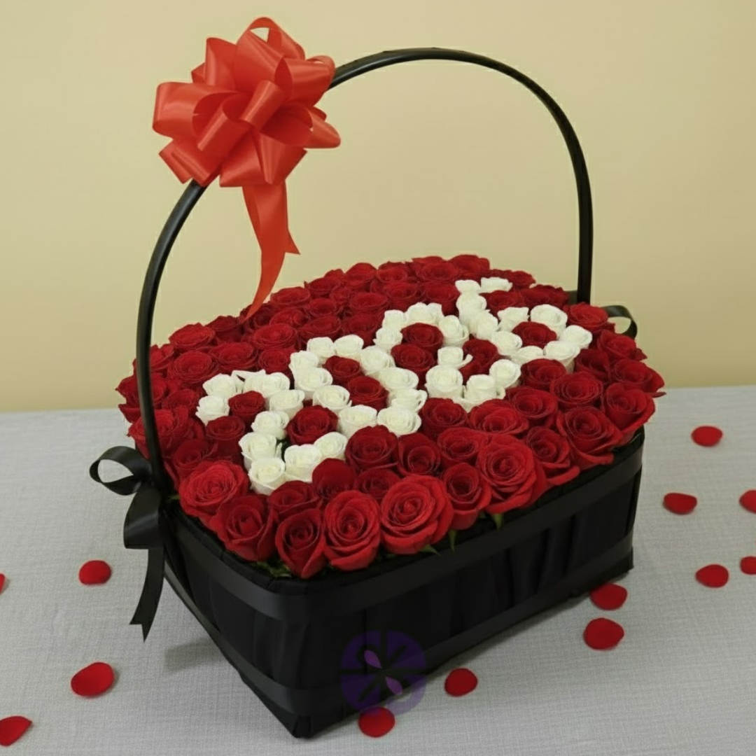 The basket is densely filled with dozens of velvety Red Roses (symbolizing deep passion and love). The central feature is the personalized design: a significant number or name is meticulously created using contrasting White Roses, making this a uniquely meaningful and cherished gift. The key advantage of this arrangement is the immediate emotional impact and the genuine, rich rose scent it delivers, ensuring your heartfelt message is received with maximum romance. It is the ultimate statement gift for wedding proposals, grand anniversaries, or celebrating a major life event.
