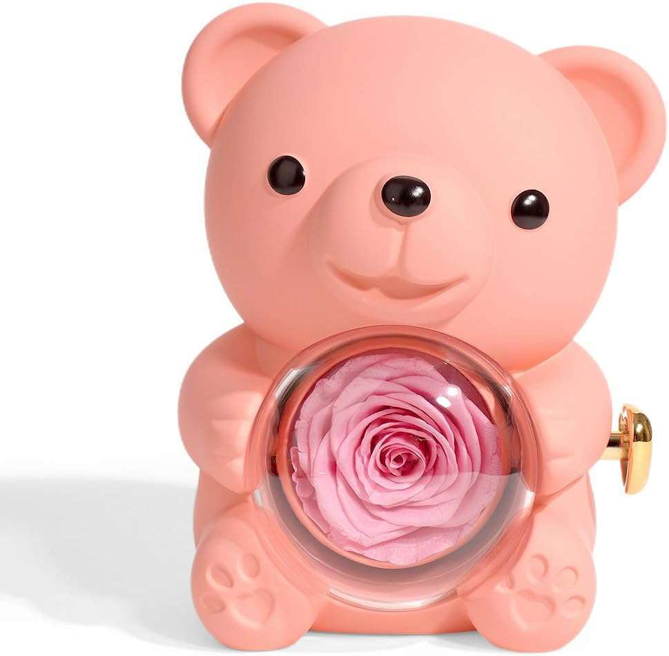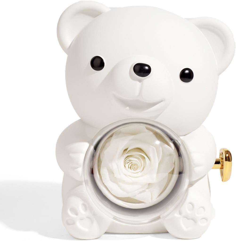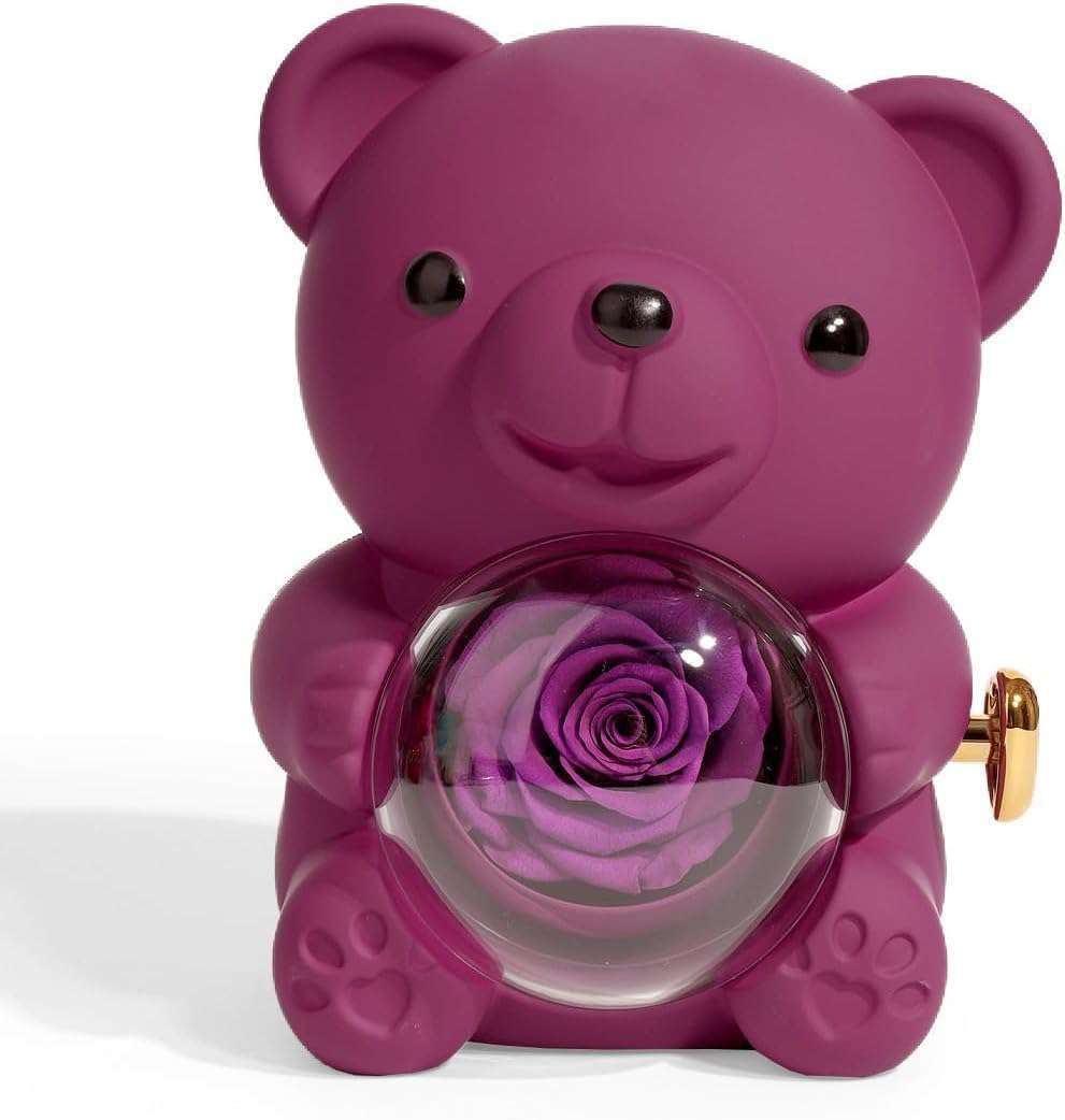 Eternal Red Rose Hug Bear Preserved Real Rose Jewelry Box