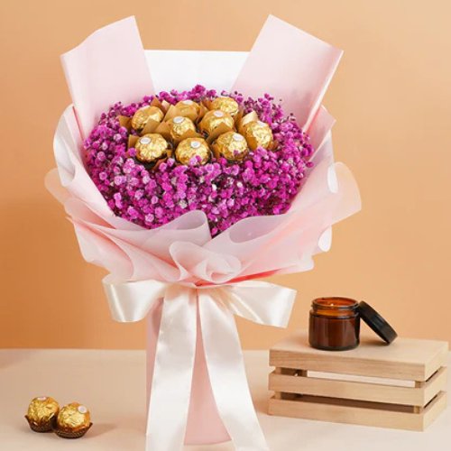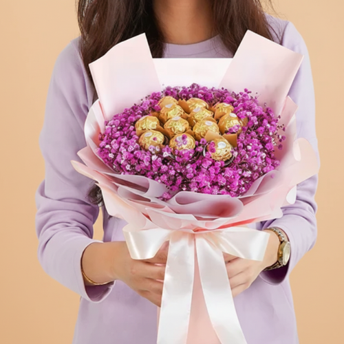 Make their day unforgettable. This exquisite bouquet is designed to be the perfect expression of love, appreciation, or celebration. More than just a gift, it’s a memorable moment wrapped in elegance. Hand-crafted with luxurious golden chocolates nestled in a cloud of vibrant purple, this beautiful arrangement says everything you can't put into words. It’s the ideal way to surprise your loved one on an anniversary, brighten a birthday, or simply show you care "just because." Choose this to deliver pure delight and leave a lasting, sweet impression.