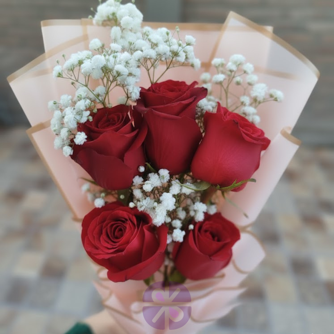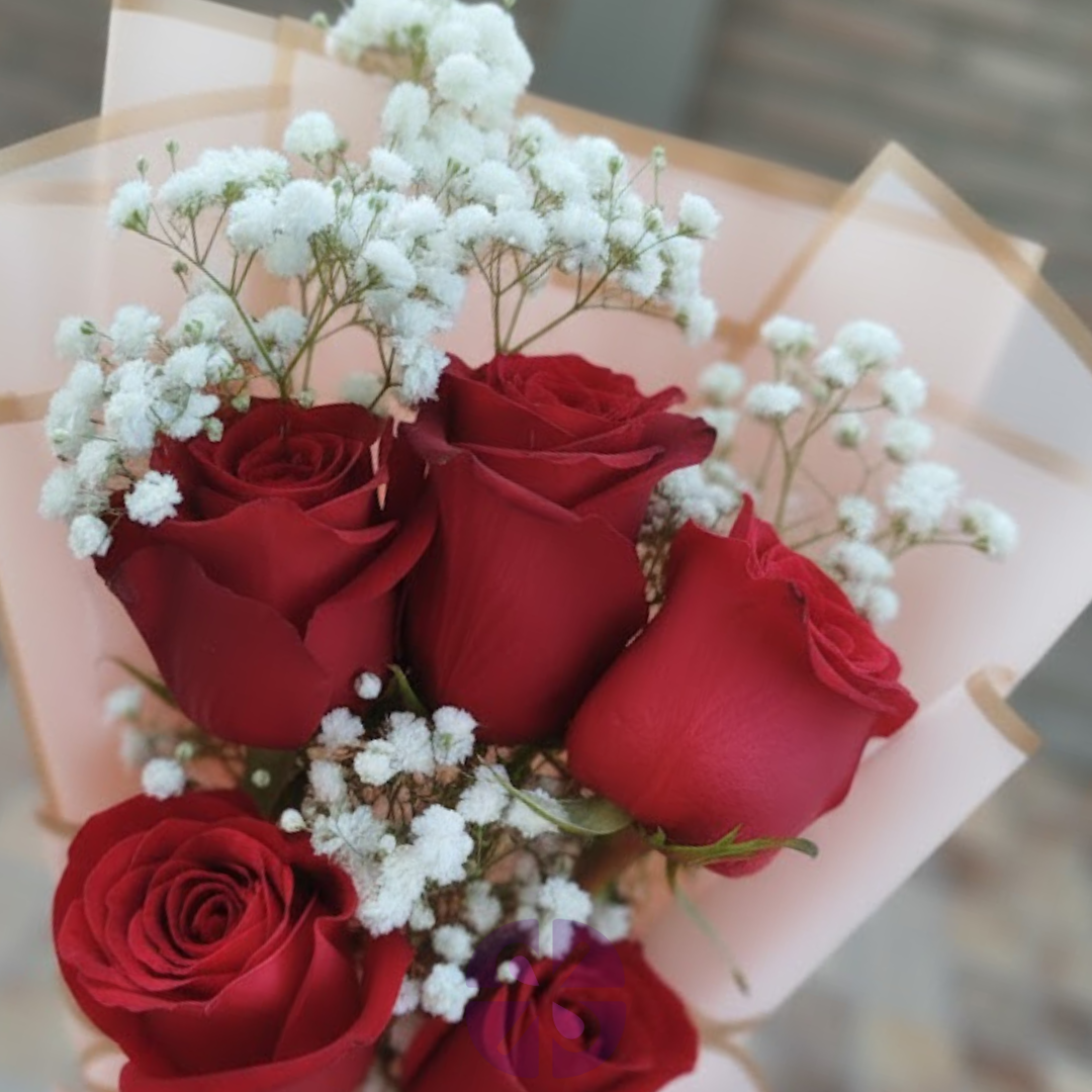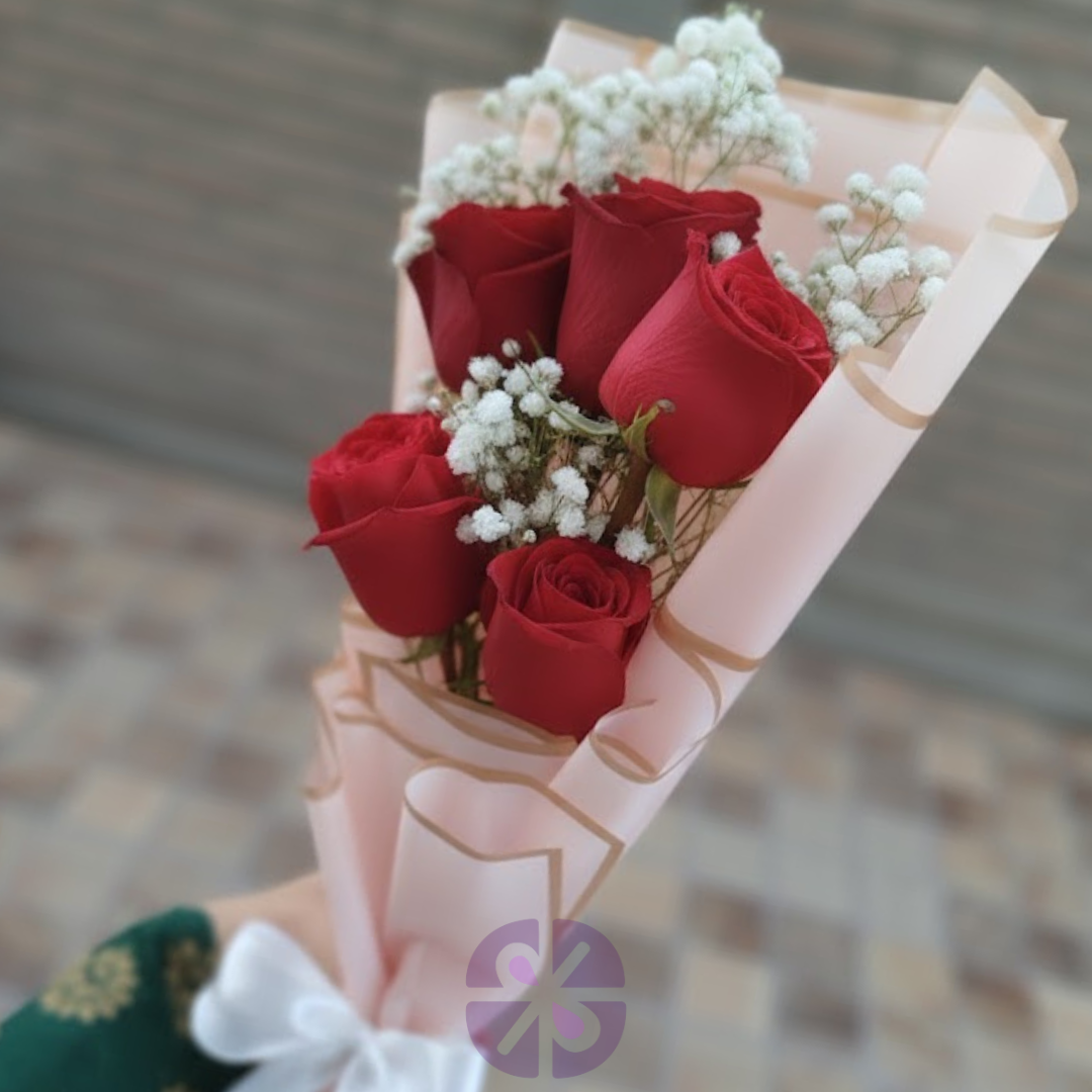 Five Chinese Red Rose Mini Bouquet in Baby Pink Wrap