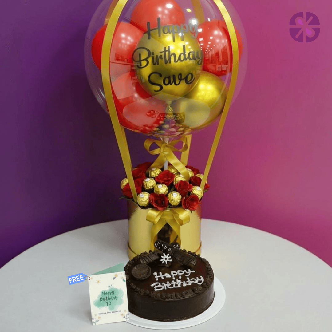 Golden Love Personalized Hot Air Balloon, Ferrero with Red Rose & Cake Combo