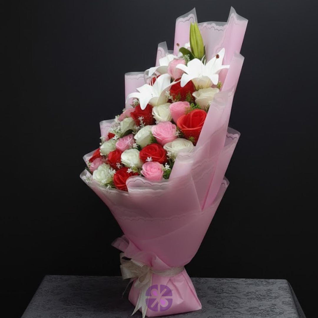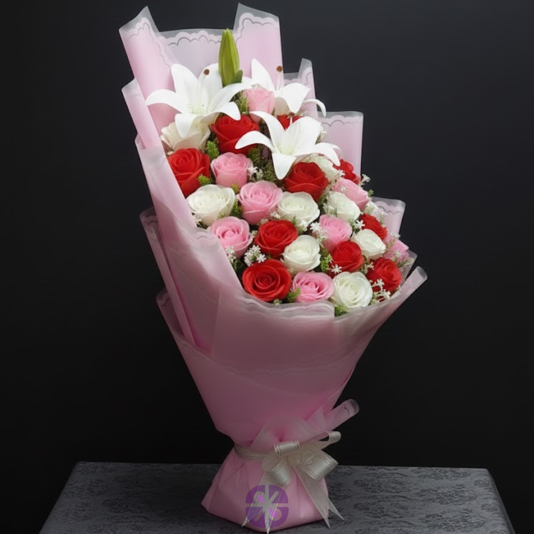 This arrangement features magnificent White Lilies (symbolizing purity and majesty), surrounded by a rich mix of Red Roses (passion), Pink Roses (admiration), and White Roses (sincerity). The key advantage of this bouquet is its durability and zero maintenance: this sophisticated artificial piece never wilts, requires no water, and remains a perfect, pristine decorative item or long-lasting, cherished gift forever. It is an ideal, stress-free gift solution that ensures lasting beauty and is perfect for expressing a complex and grand message of mixed affection on any celebration day.