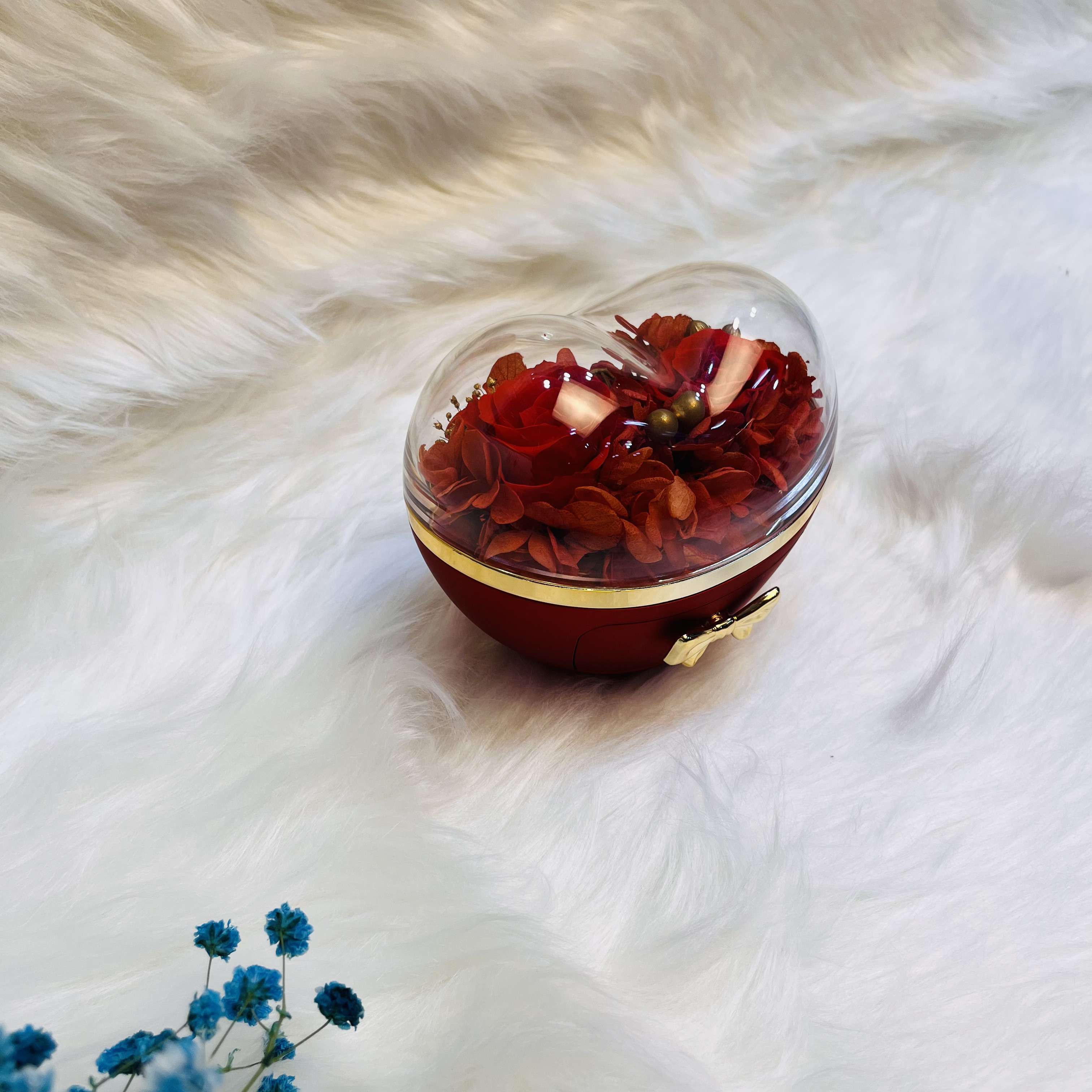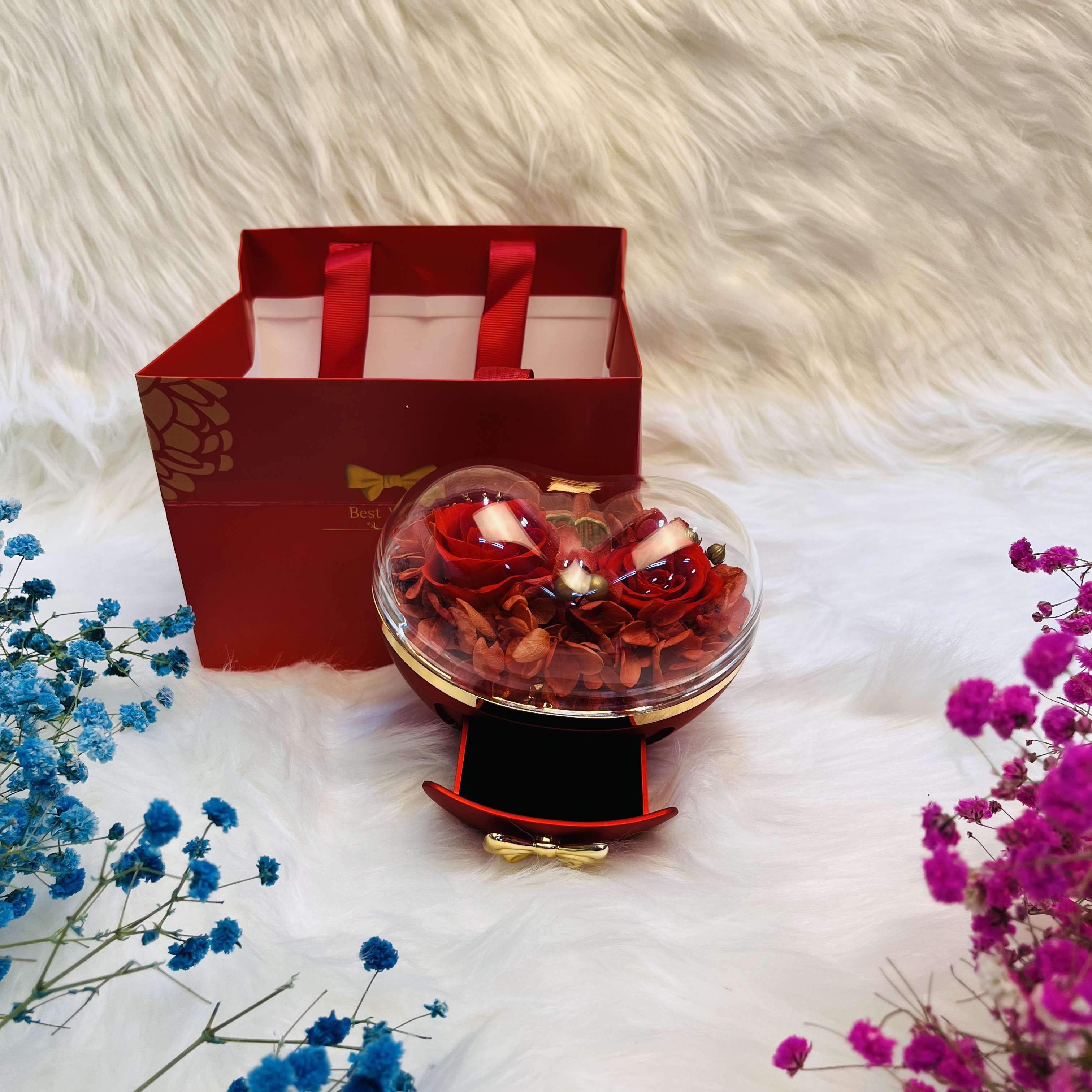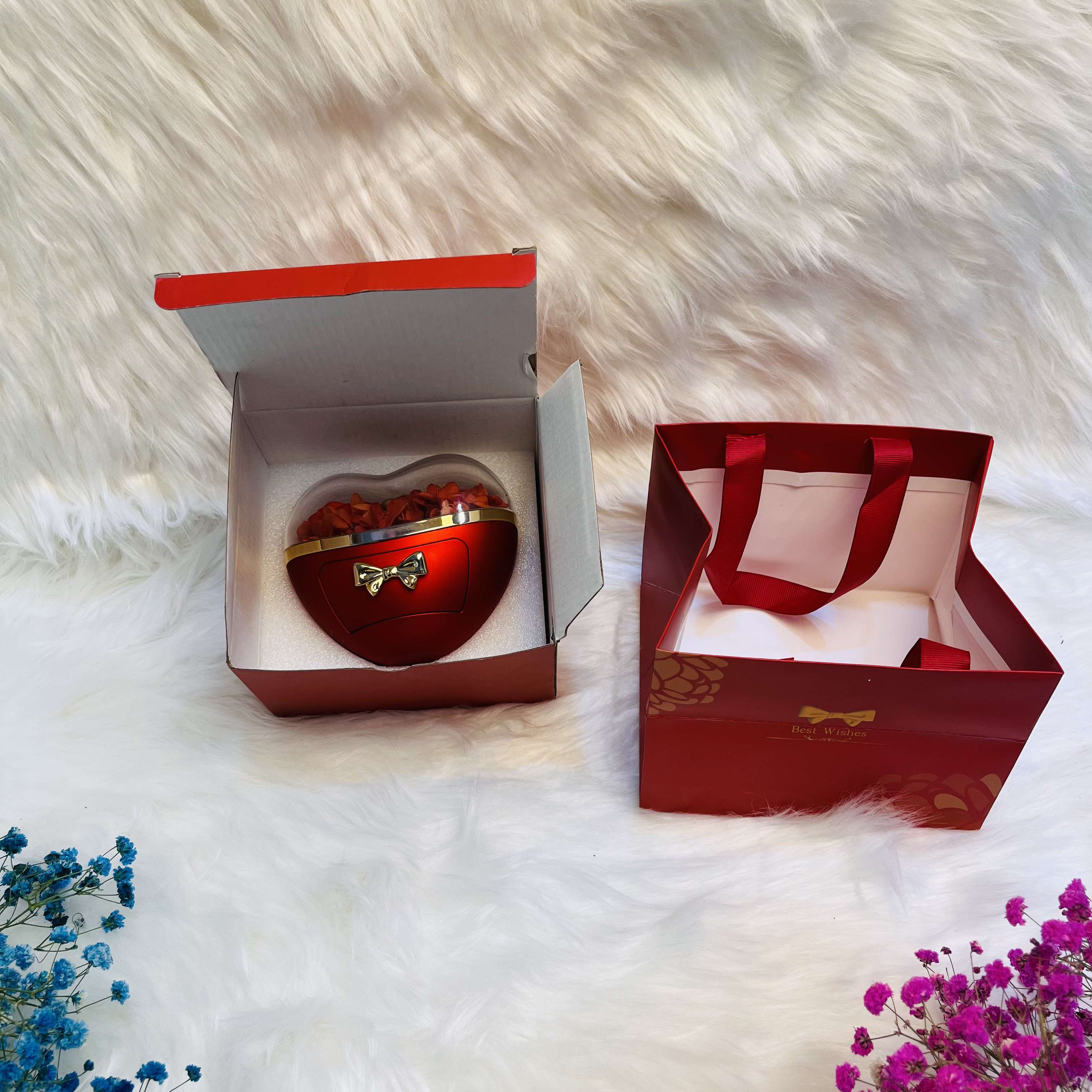 Heart-Shaped Jewelry Box with Preserved Dry Red Roses & Gift Bag