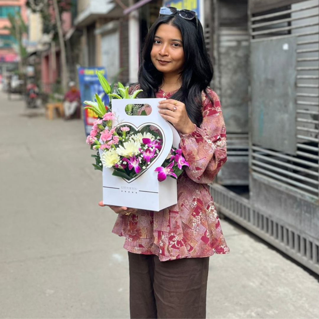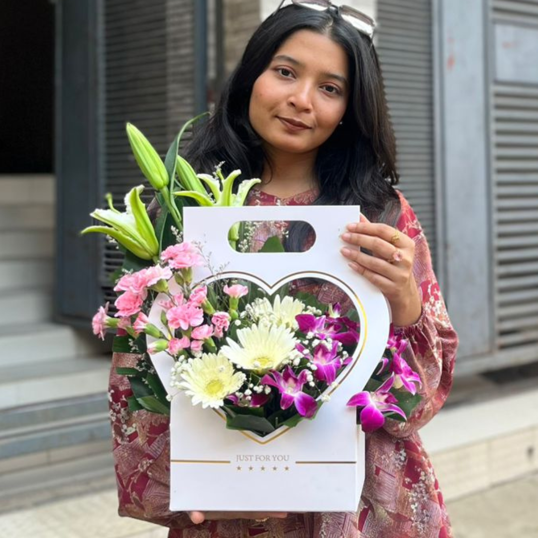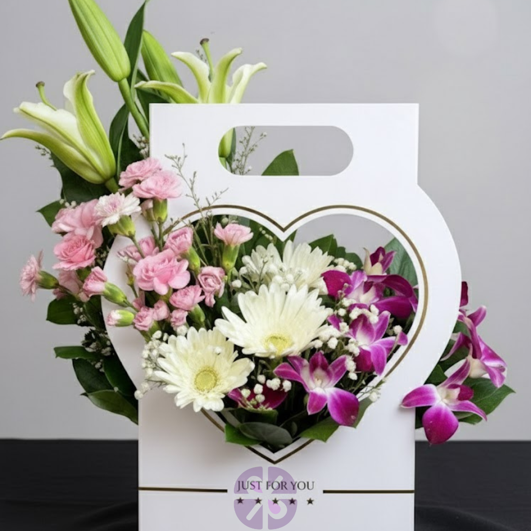 Heartfelt Affection Orchid, Gerbera, Carnation & Lily Flower White Love Shape Bag