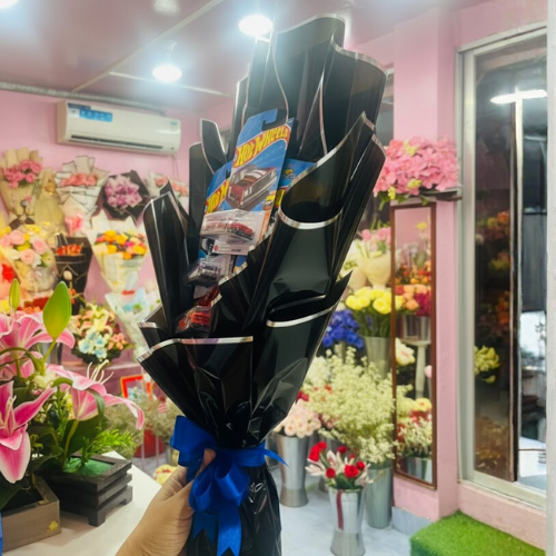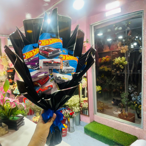This is a creatively assembled Hot Wheels Car Bouquet, a revolutionary non-floral alternative to a traditional bouquet. Instead of flowers, it features a collection of various, highly sought-after Hot Wheels die-cast model cars, each presented in its original packaging. The cars are artfully arranged and wrapped in sleek, contrasting black premium wrapping paper, tied with a bold blue ribbon to give it a sharp, masculine, and dramatic presentation.
