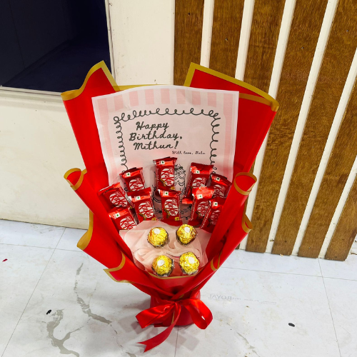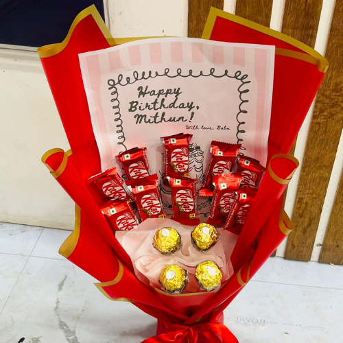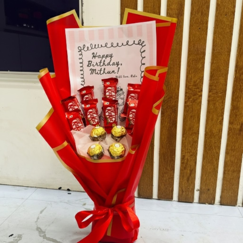 Make your love confession extra sweet with this adorable “I Love You More Than Chocolate” bouquet! Featuring a vibrant arrangement of KitKat bars and premium Ferrero Rocher chocolates nestled in elegant red wrapping, this gift is perfect for anniversaries, proposals, or romantic surprises. Whether it's Valentine’s Day or a just-because moment, this thoughtful gift will melt hearts and bring smiles. Show them how much you care — beyond chocolate!