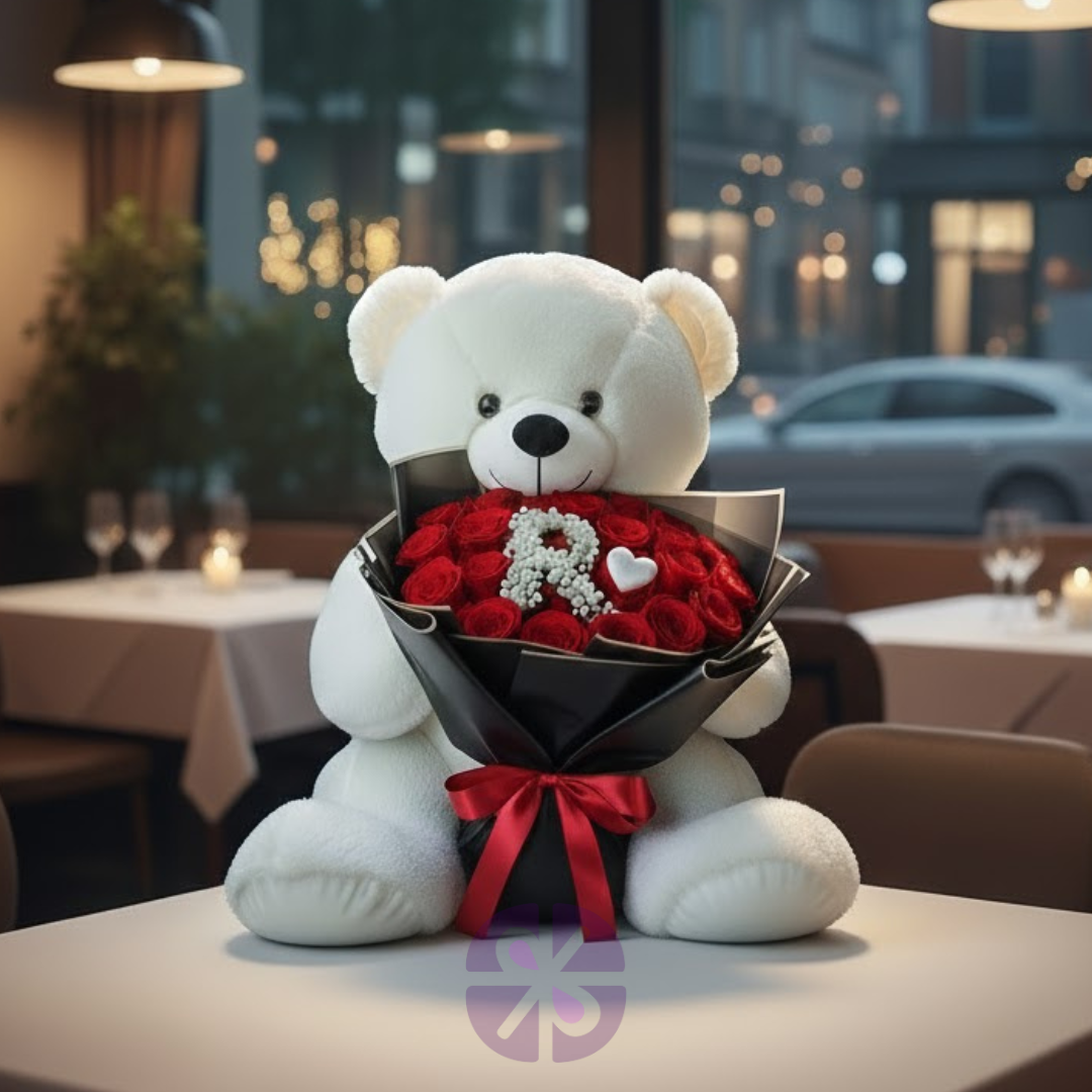 luxurious white teddy bear cradling an elegant, fresh bouquet of deep red roses. The soft plush texture of the teddy combined with the deep, passionate color of the roses creates a timeless and profoundly romantic presentation, perfectly suited for proposals, Valentine's Day, or a grand anniversary surprise. The setting suggests a beautiful evening dinner, emphasizing the romantic impact of the gift.