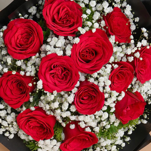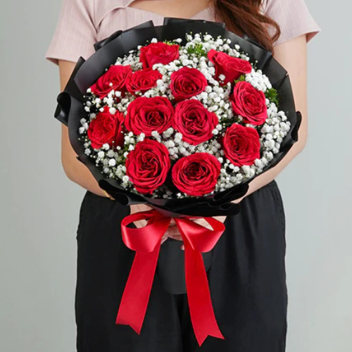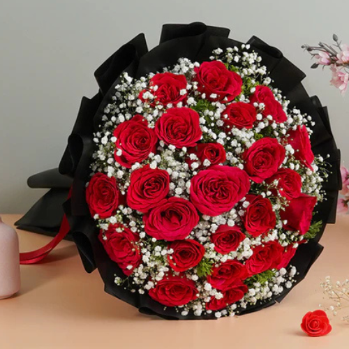 Luxury Noir Red Roses, Baby's Breath & Black Wrap Statement