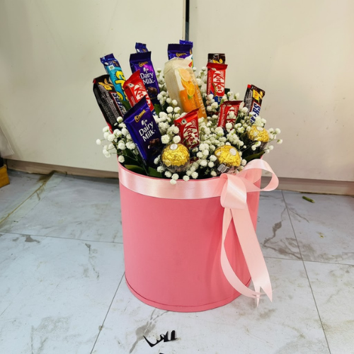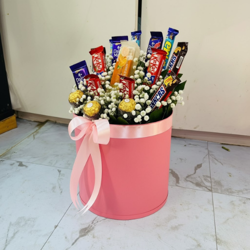 This product is a decadent and stylish Chocolate and Floral Gift Bucket. The base is a beautiful pink round box tied with a satin ribbon. The arrangement features a diverse selection of Mix Brand Chocolates (including Dairy Milk, KitKat, Snickers, and Ferrero Rocher) arranged artistically among fresh filler flowers, primarily Baby's Breath (Gypsophila).