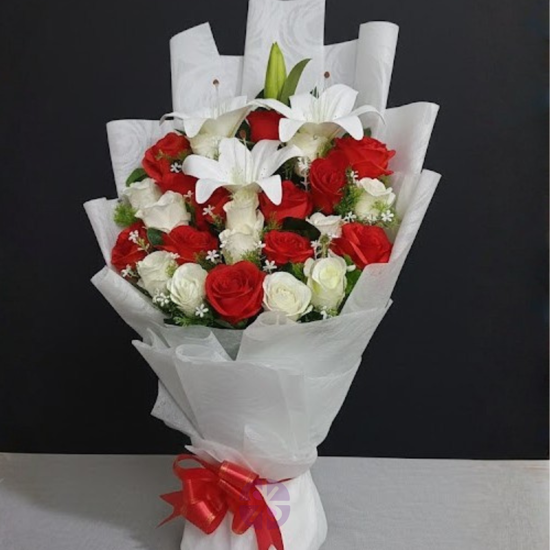 This arrangement features a rich mix of classic flowers: vibrant Red Roses (symbolizing deep passion and love) and pure White Roses (sincerity and reverence), crowned by magnificent White Lilies (purity and majesty). The striking combination of Red and White provides a powerful, universally recognized symbol of mixed affection. The key advantage of this bouquet is its durability and zero maintenance: this sophisticated artificial piece never fades, requires no water, and remains a perfect, pristine decorative item or long-lasting, cherished gift forever. It is an ideal, stress-free gift solution that ensures lasting elegance for anniversaries, Valentine's Day, or grand gestures.