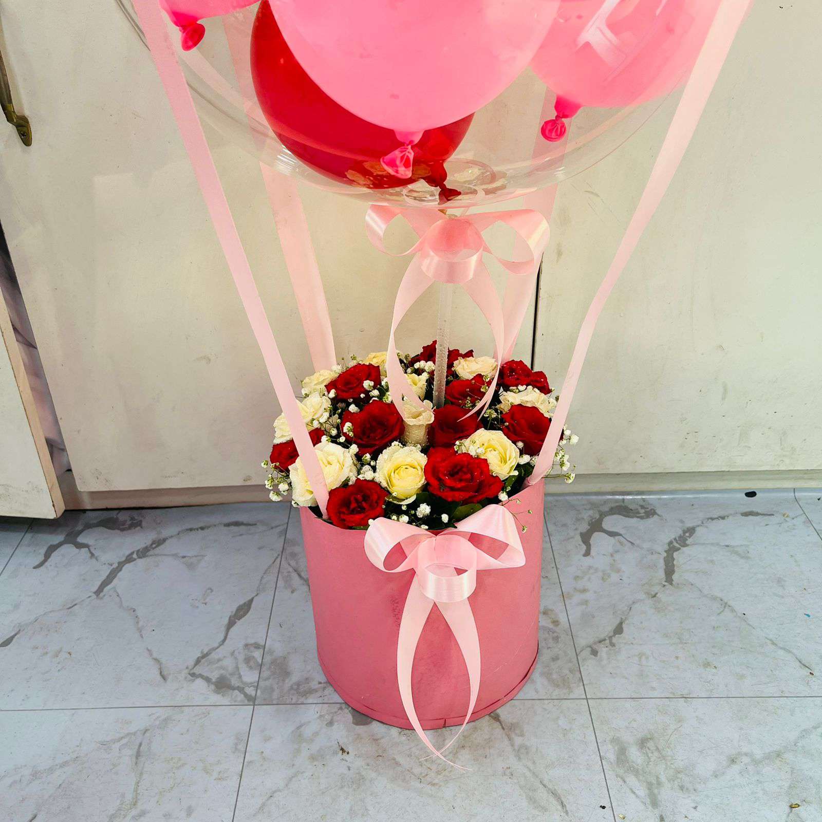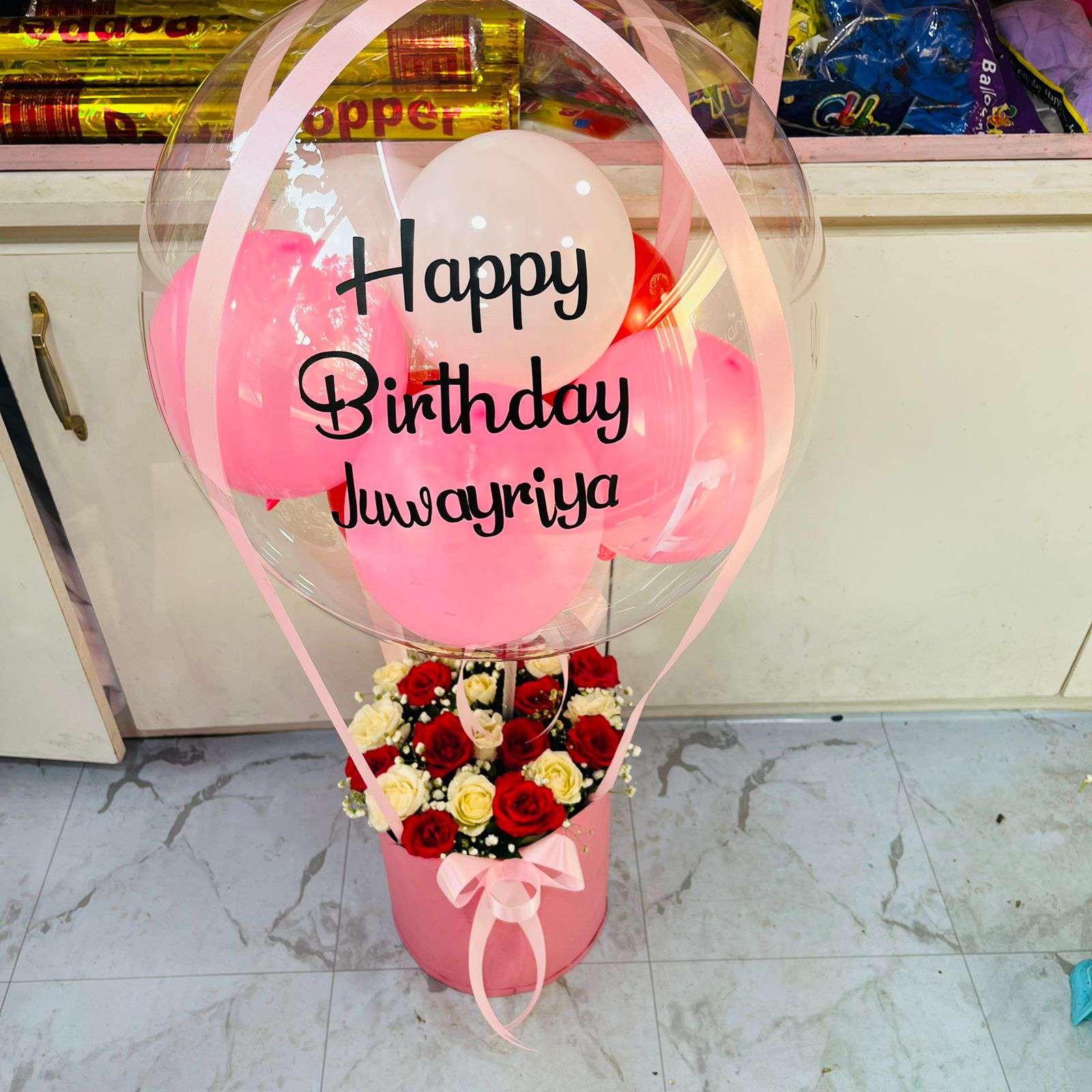 This product is a captivating Luxury Flower and Balloon Arrangement. It features a large, clear Bubble Balloon personalized with a custom message (e.g., "Happy Birthday Juwayriya"), filled with smaller pink and white balloons. This acts as the "hot air balloon" element, attached to a stylish pink round box containing a vibrant arrangement of Premium Local Roses in mixed Red and White colors, accented with delicate filler flowers.