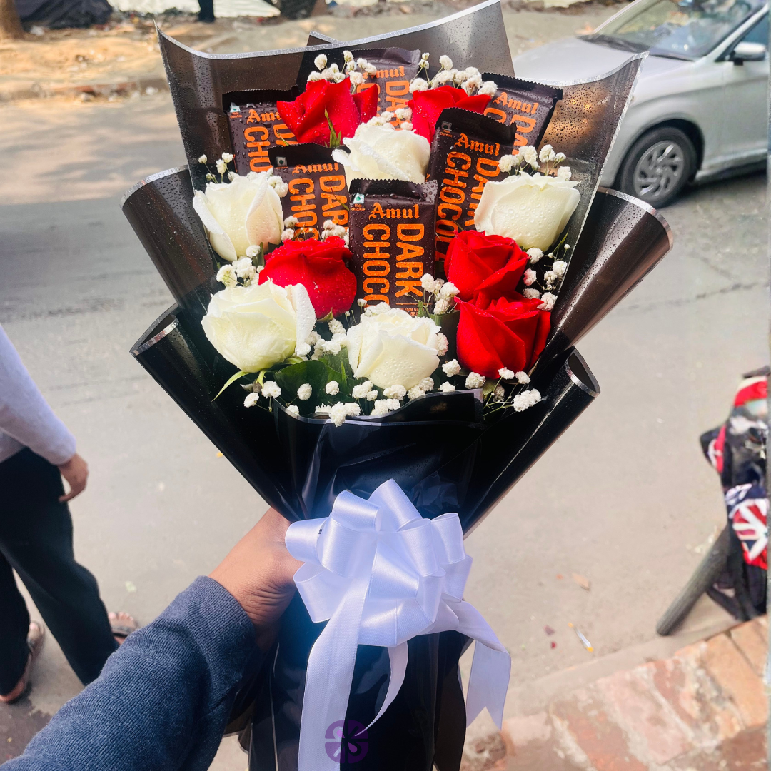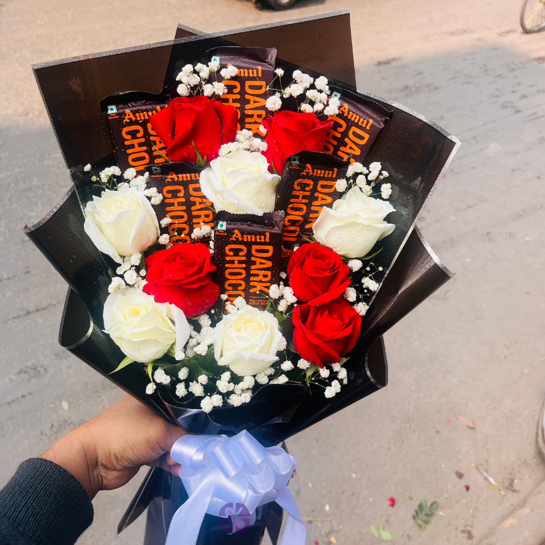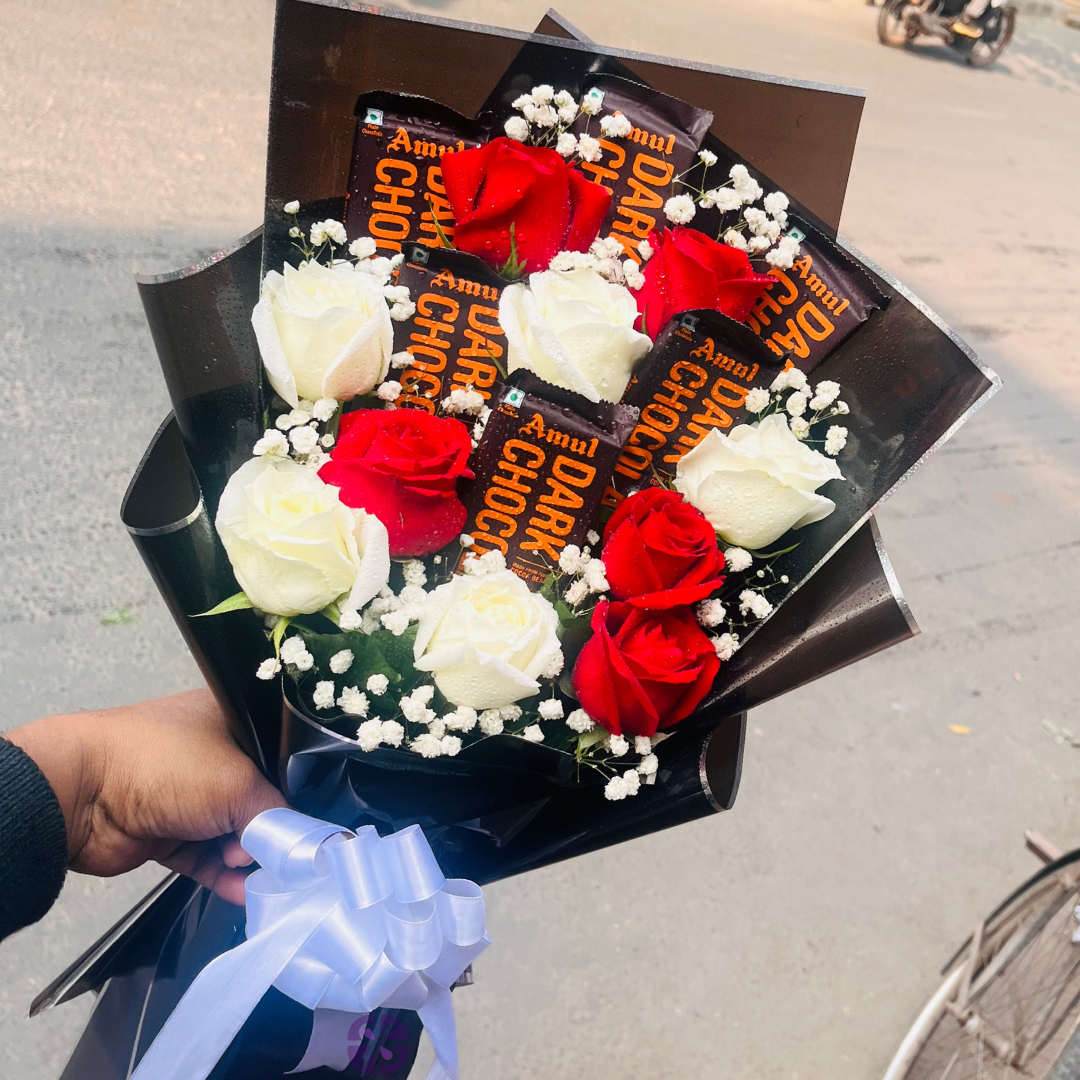 Premium 6 Amul Dark Chocolate and 10 Red & White Rose Fusion Bouquet
