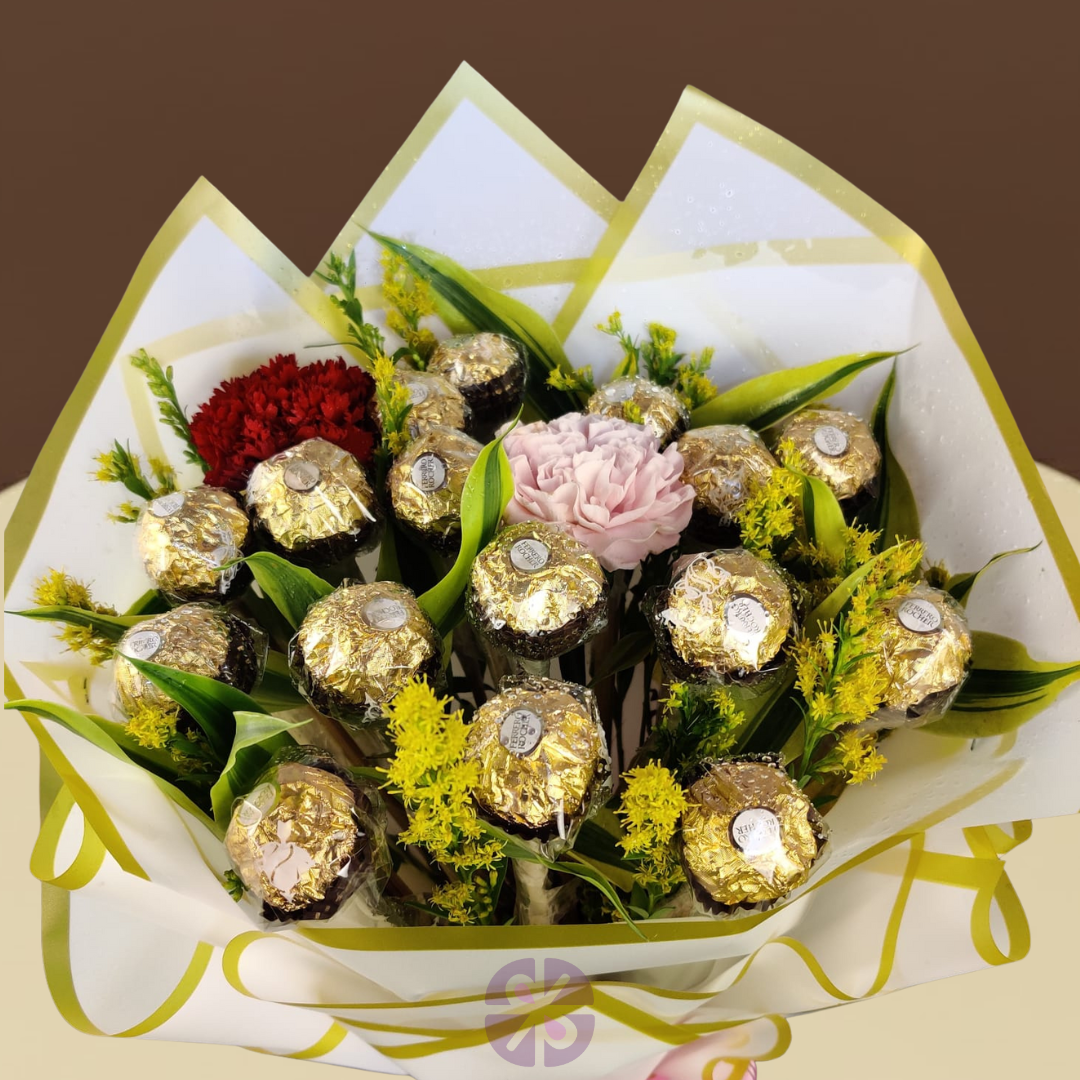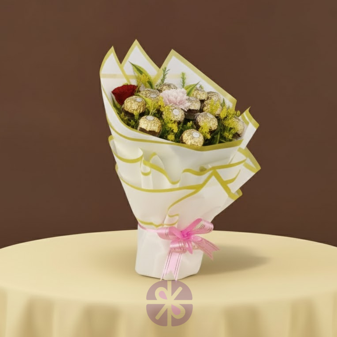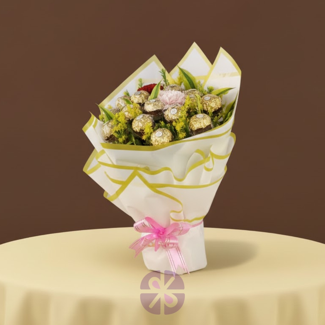 Why will they be instantly captivated? Because it offers a rich mix of sensory delights. It features approximately 16 Pieces of Premium Ferrero Rocher Chocolates (perfectly nestled among the blooms). These are beautifully accented by: