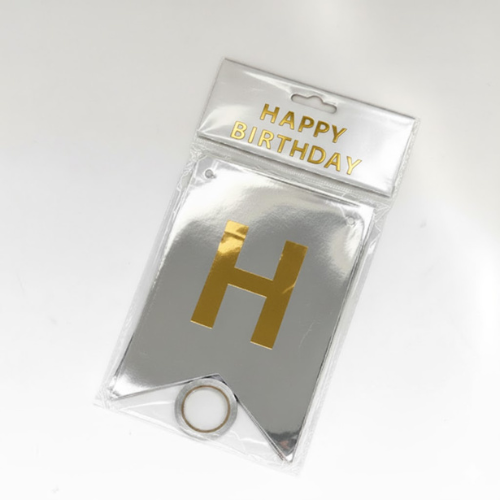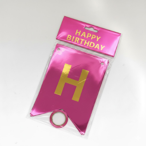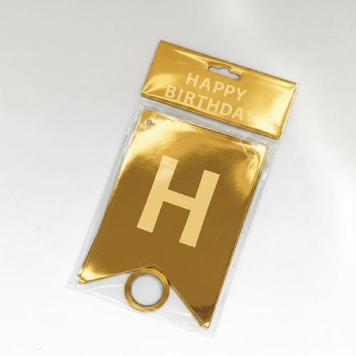 This is a comprehensive set of Happy Birthday Banner Flags, designed for party decoration. Each letter of the phrase "HAPPY BIRTHDAY" is individually printed in shimmering gold foil onto a sturdy cardstock flag. The flags are shaped in the classic "fishtail" or swallowtail design. The product is available in a wide range of vibrant colors, as pictured (including Red, Purple, Blue, White, Pink, Yellow, Black, Navy Blue, etc.), allowing customers to select a color that perfectly suits their party theme. The set comes pre-punched and includes ribbon for easy assembly and hanging