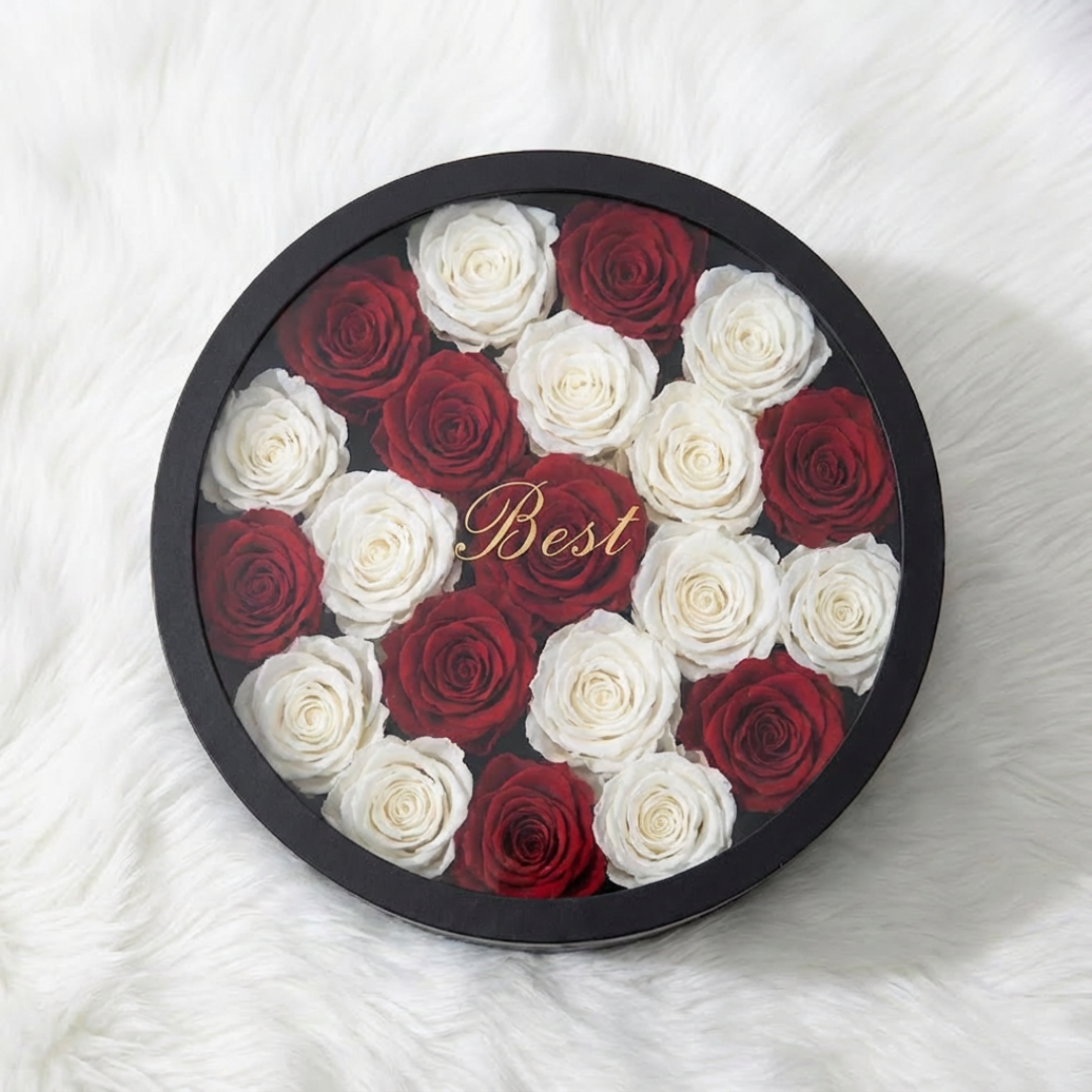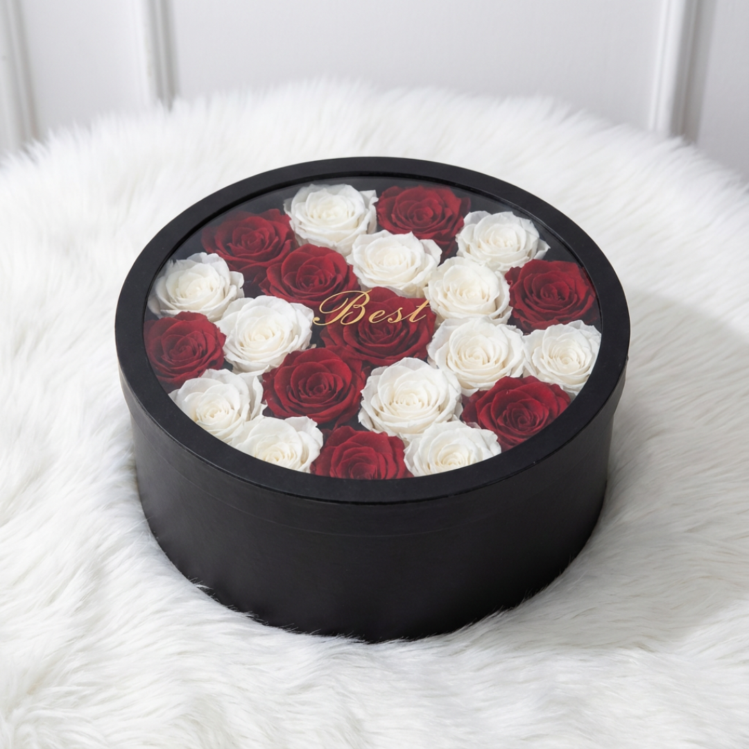 Premium Red and White Rose Arrangement in Black Round Box