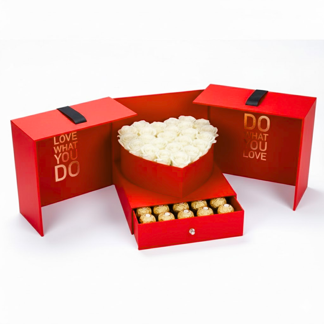 Premium Red Rose Heart & Ferrero Rocher Drawer in Matte Black Luxury Box