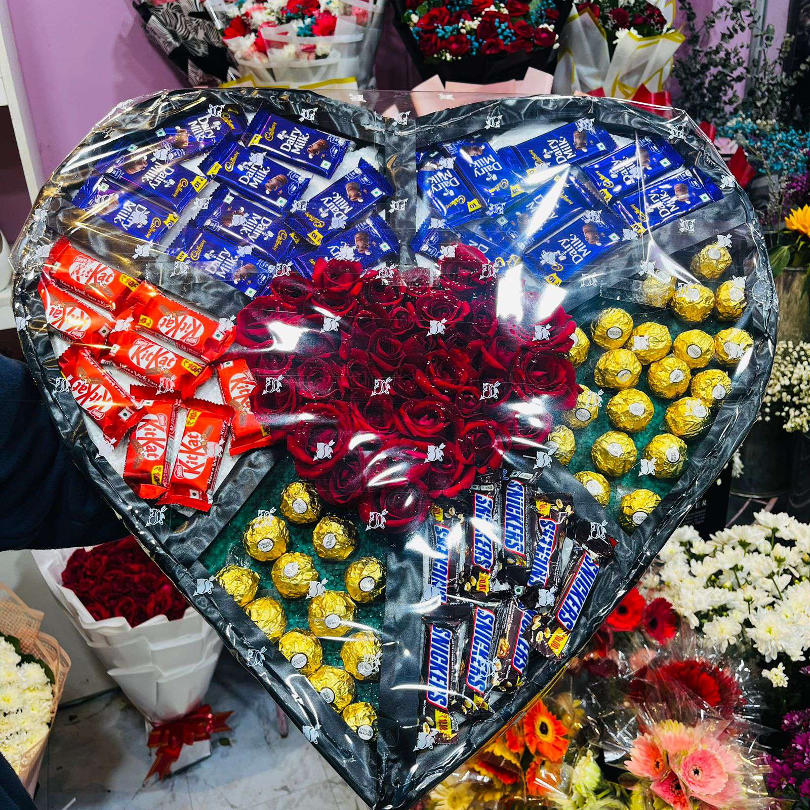 This is an exquisite heart-shaped gift platter, thoughtfully divided into sections to offer a perfect blend of floral beauty and sweet indulgence. At the very core of this arrangement is a central heart-shaped display of fresh Red Roses, symbolizing deep passion and romantic affection.