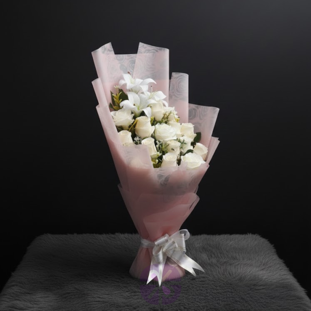 It features a rich collection of White Roses (symbolizing reverence and eternal love) and prominent White Lilies (representing purity and majesty). The key advantage of this bouquet is its durability and zero maintenance: this artificial bouquet never fades, requires no water, and remains a perfect, pristine decorative item or cherished gift forever. Its sheer volume and all-white theme ensure a luxurious, high-impact statement perfect for weddings, anniversaries, or long-lasting home decor.