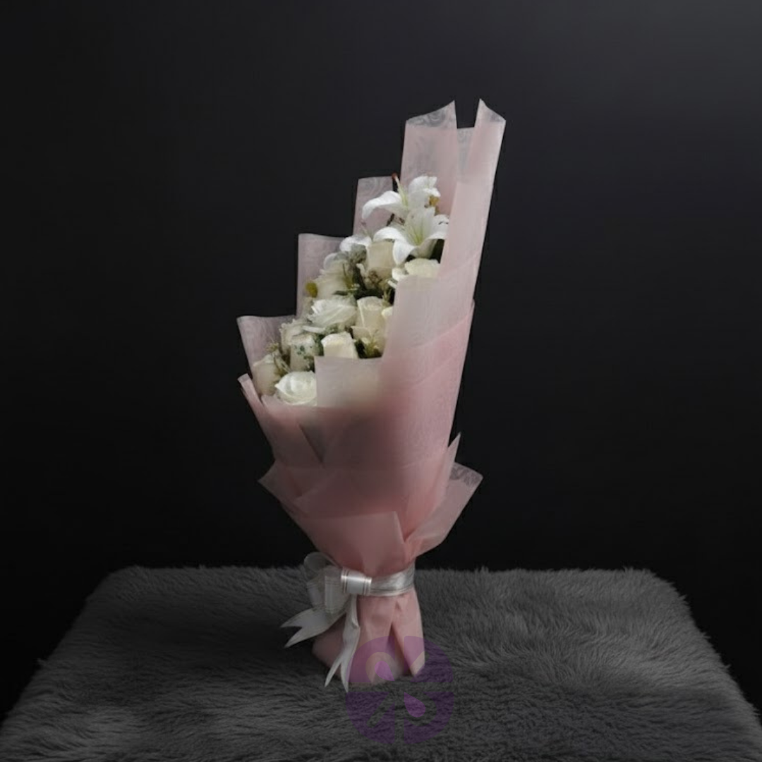 This beautiful floral arrangement is a magnificent, pristine, and sophisticated display, meticulously crafted from high-quality artificial silk to ensure permanent and realistic beauty. It is presented as a tall, voluminous Stand Bouquet, showcasing an abundance of all-white flowers elegantly wrapped in Soft Pink Paper.