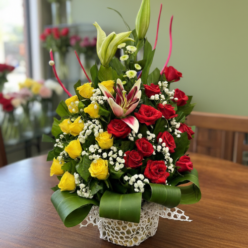 A vibrant basket bursting with the cheerful beauty of sunny yellow roses and the passionate charm of deep red roses. Enhanced with delicate gypsophila, lush greenery, and a striking lily centerpiece, this arrangement is perfect for celebrating love, joy, and togetherness on any special occasion.