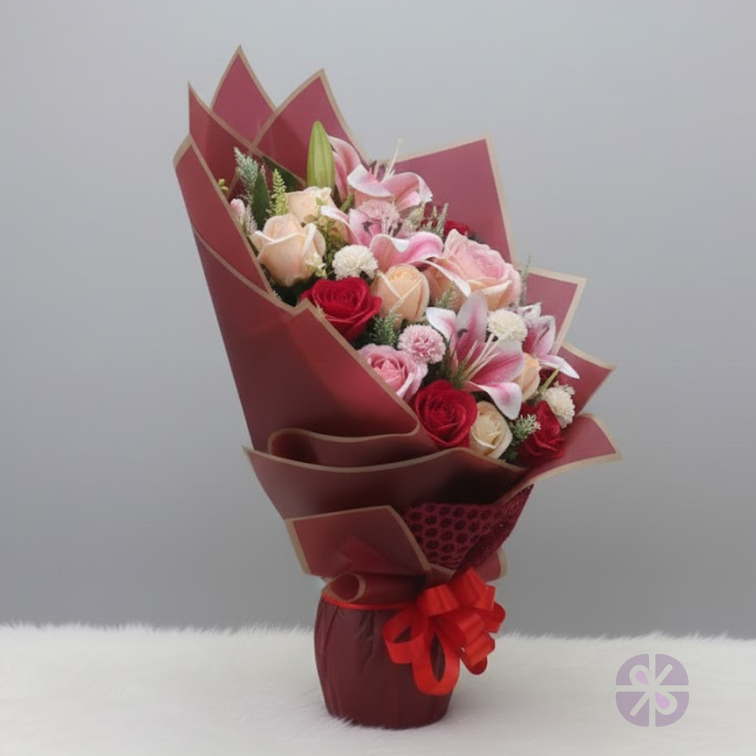 This stunning arrangement instantly captivates with its dramatic color contrast and impressive stature. It features a rich collection of White Roses, Pink Roses, and Deep Red/Maroon Roses, beautifully accented by prominent Pink Lilies (symbolizing affection and prosperity). The key advantage of this bouquet is its durability and zero maintenance: this artificial bouquet never fades, requires no water, and remains a perfect, elaborate decorative item or cherished, lasting gift forever. The sophisticated mix of three rose shades and the central Pink Lily ensures a high-impact, full presentation ideal for any luxurious occasion or permanent interior display.