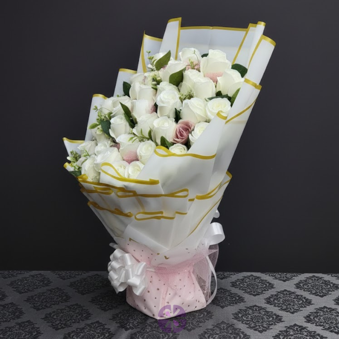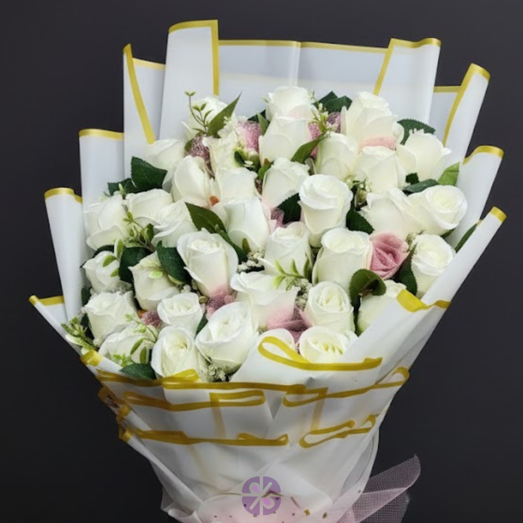 This arrangement features a generous quantity of uniform White Roses (symbolizing purity, reverence, and innocence), creating a luxurious, monochromatic, and powerful statement. The All-White Theme coupled with the high volume of blooms, ensures a visually stunning and upscale presentation. The key advantage of this bouquet is its durability and zero maintenance: this sophisticated artificial piece never fades, requires no water, and remains a perfect, pristine decorative item or long-lasting, cherished gift forever. It is an ideal, stress-free gift solution that guarantees lasting elegance for weddings, proposals, or formal events.