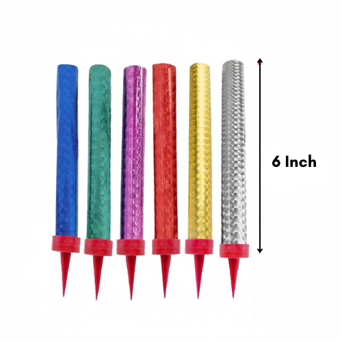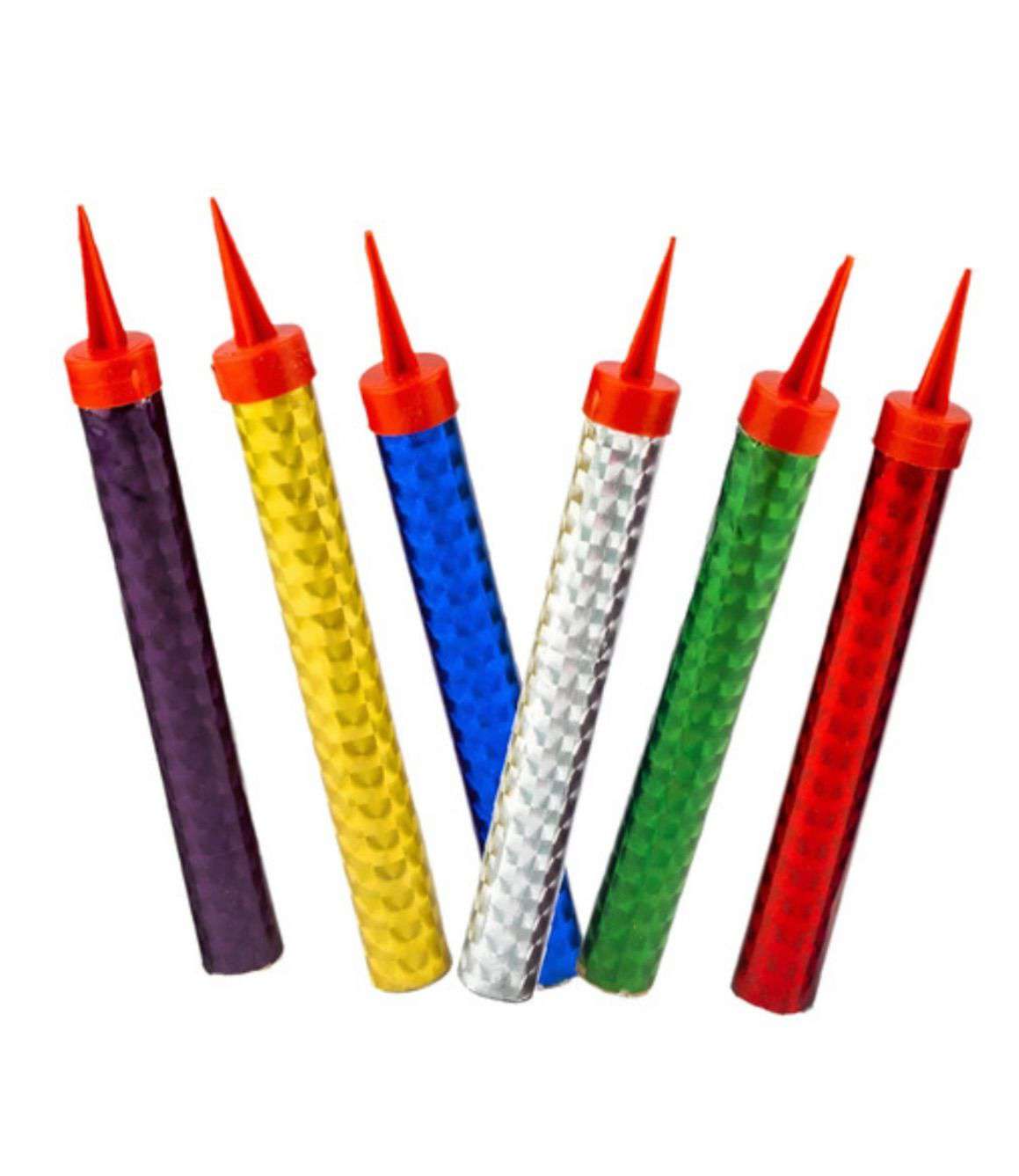 This is a pack of Cake Sparkler Candles, sometimes referred to as 'Ice Fountains' or 'Indoor Fireworks'. These are small, non-toxic pyrotechnic items designed specifically to be placed upright on a birthday cake. Once lit, they safely emit a dazzling fountain of bright, cold sparks (resembling a mini indoor firework display) that lasts for several exciting seconds. The set contains multiple sparklers in vibrant colors like Silver, Purple, Blue, Red, Gold, and Green, each with a secure plastic spike for placement.