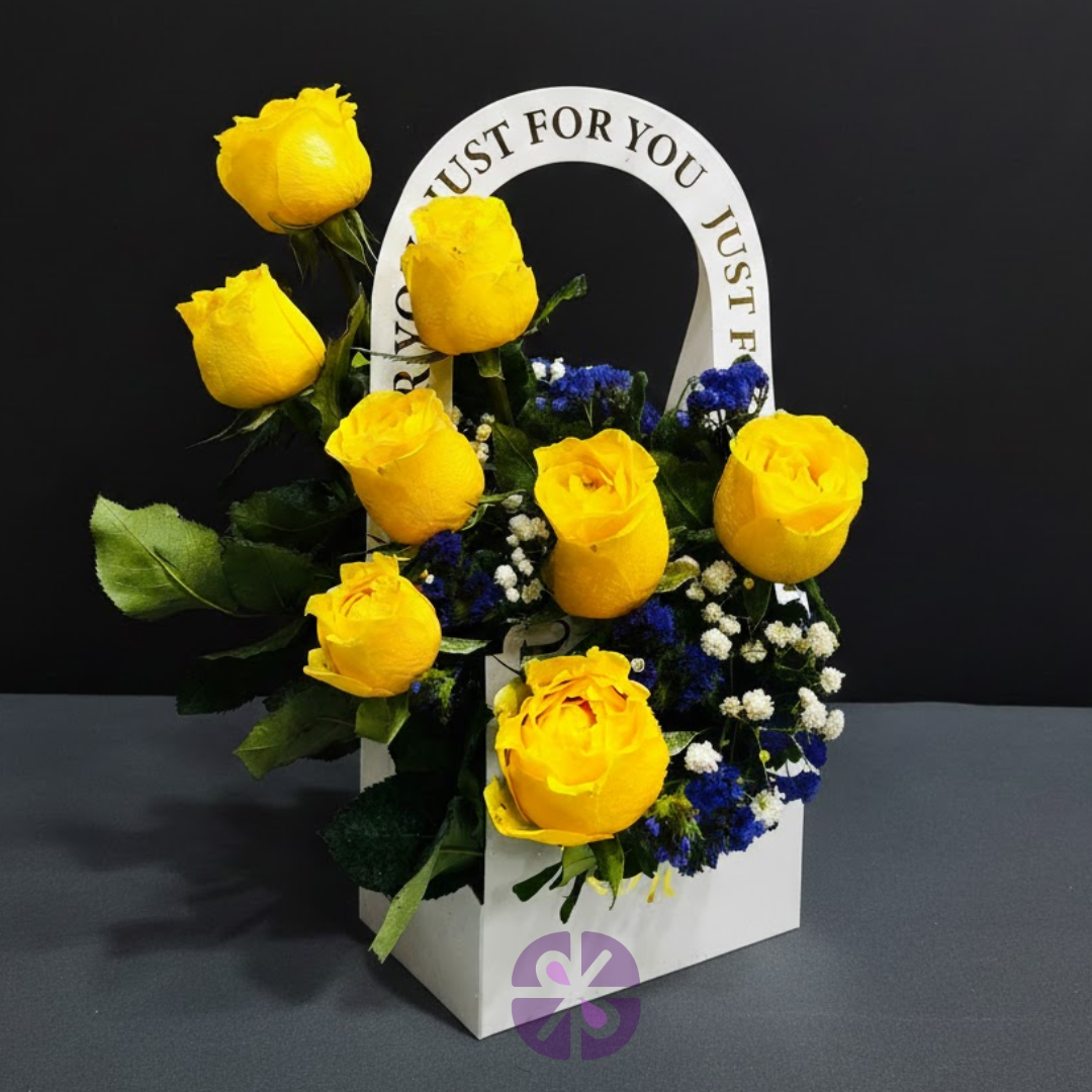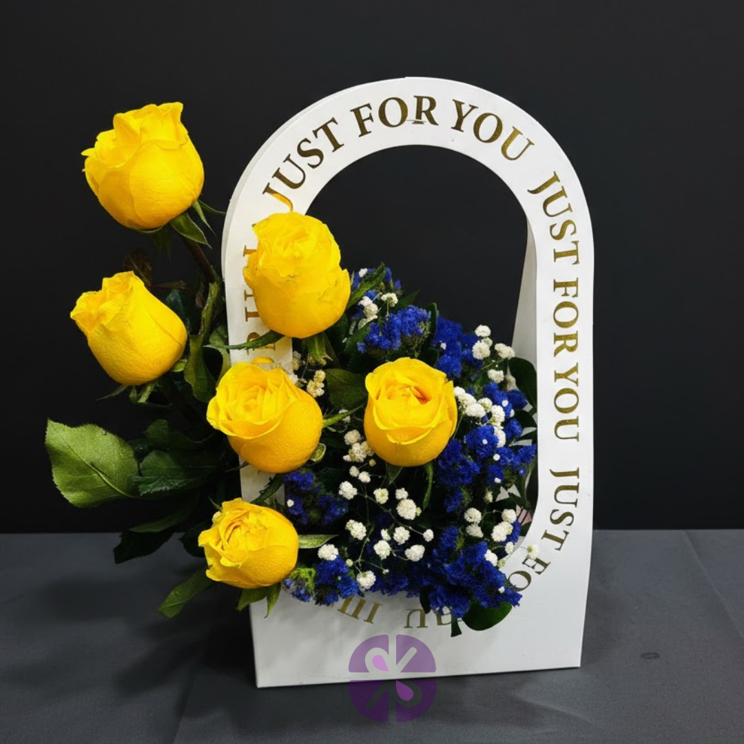 Sunshine Elegance Premium Yellow Rose & Blue Statice "Just For You" Gift Bag