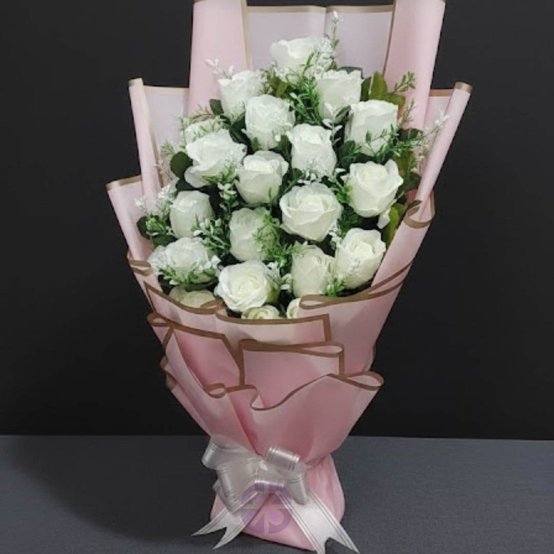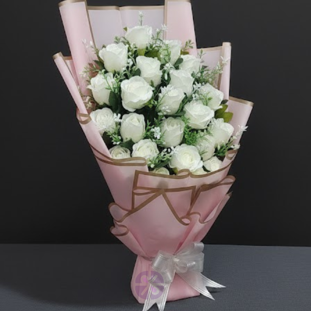 This arrangement features an abundance of uniform White Roses (symbolizing purity, innocence, and reverence), creating a luxurious, clean composition. The Soft Pink Wrapping provides a charming, romantic contrast to the pure white blooms, making the bouquet visually pop. The key advantage of this bouquet is its durability and zero maintenance: this sophisticated artificial piece never fades, requires no water, and remains a perfect, pristine decorative item or long-lasting, cherished gift forever. It is an ideal, stress-free gift solution that ensures lasting elegance for any occasion needing a touch of gentle romance.