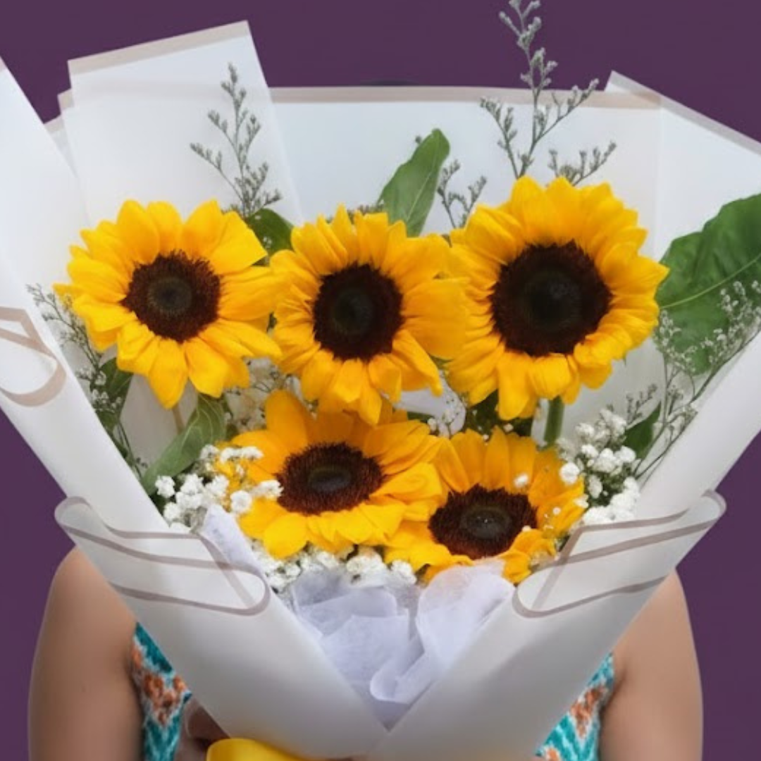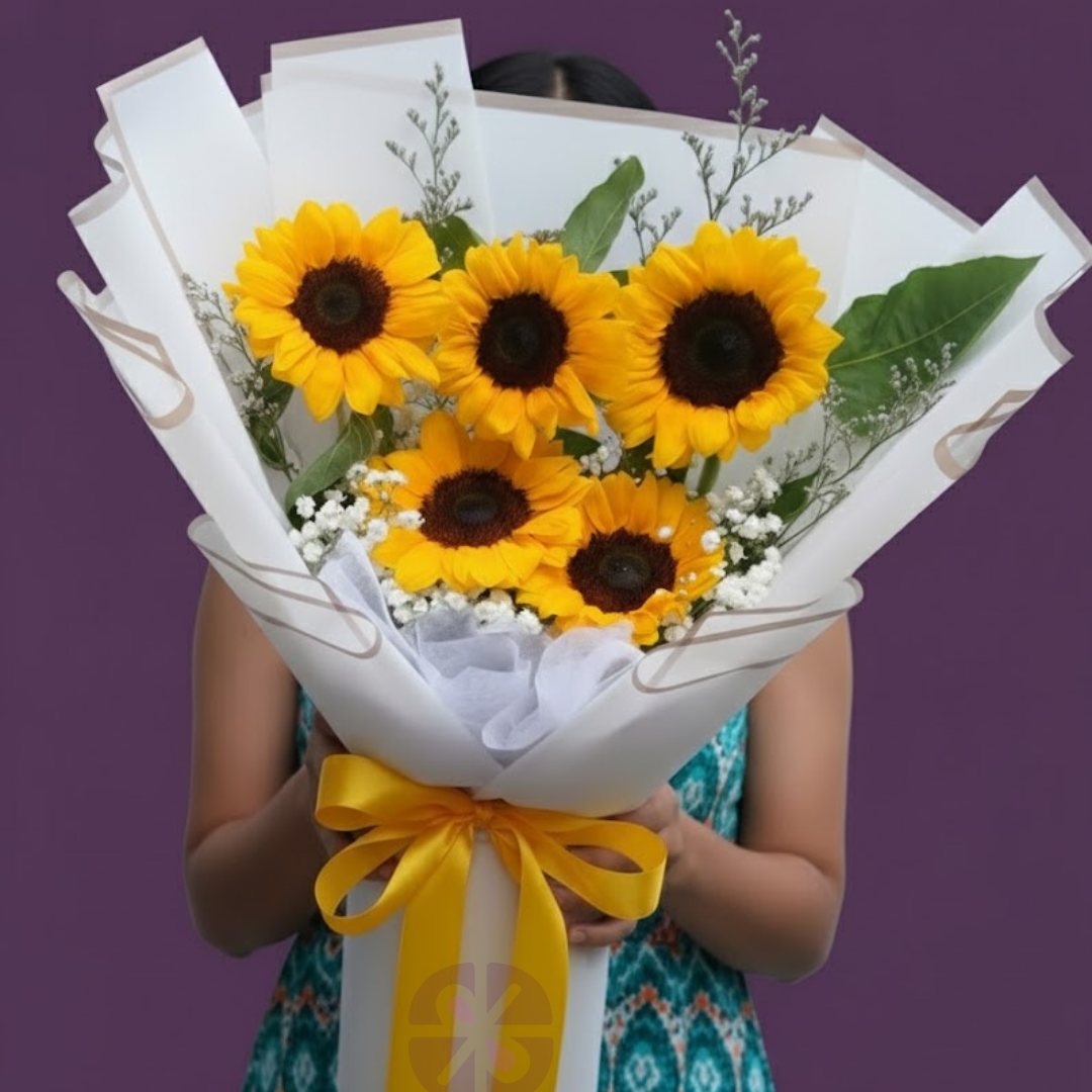 This product is a large, happy, and elegant Floral Hand Bouquet. It holds about 5 bright Sunflowers, which are known for bringing joy and symbolizing adoration. The sunflowers are beautifully framed by light, fluffy white filler flowers (like Baby's Breath) and some green leaves. The whole bouquet is wrapped beautifully in clean White paper with brown or gold line details, tied with a bright Yellow satin ribbon.