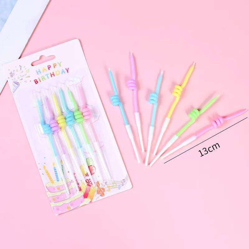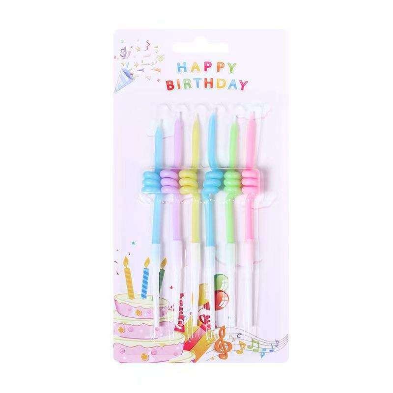 It features a fun set of six Multi-Color Spiral Candles, designed with a unique twisted body and bright, inviting pastel colors (pink, green, blue, yellow, purple). These eye-catching candles instantly transform any birthday cake into a focal point of joy and festivity. They are the ideal thoughtful gift for adding a playful and colorful touch to any birthday cake, making the wish-making moment extra special and memorable..