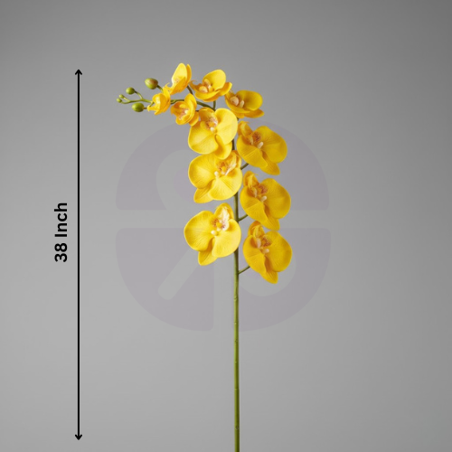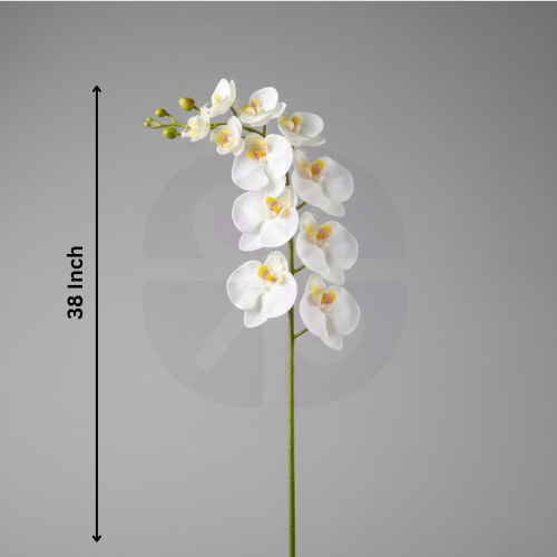 This product is a magnificent, single-stem Artificial Phalaenopsis Orchid. It features multiple open blooms and buds arranged vertically along a long, flexible stem, mimicking the graceful cascade of a natural orchid. The large petals are crafted from Velvet Silk for a luxurious feel, complemented by realistic green foliage. It is available in classic White (as pictured) and Yellow.