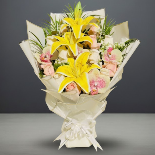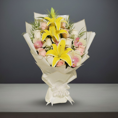 This stunning arrangement features a lavish mix of premium-grade, realistic artificial flowers, meticulously designed to look and feel indistinguishable from fresh blooms. The vibrant combination of colors and textures creates an opulent, lasting display that never wilts. Expertly wrapped and tied with a grand bow, it's the perfect investment gift for home decor, a long-distance relationship, or a meaningful celebration where the memory must last forever. Give the gift of eternal luxury and beauty.