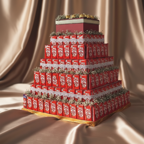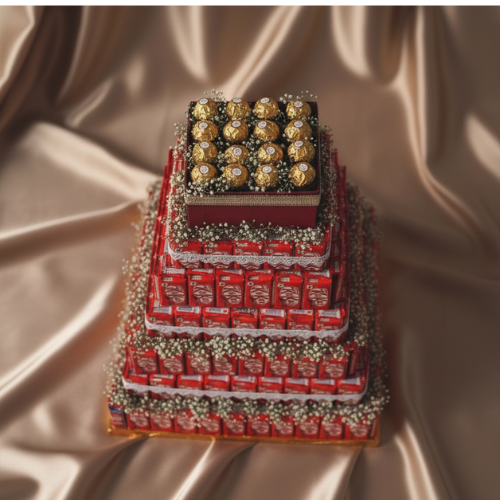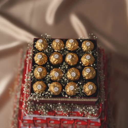 We've shattered tradition to bring your loved one this spectacular, multi-tiered chocolate tower. Each level is built with the comforting crunch of beloved KitKat bars, adorned with delicate Baby's Breath and elegant lace trim to give it a soft, sophisticated flair. Capping this marvel is a luxurious box of golden Ferrero Rocher, adding the perfect premium touch.