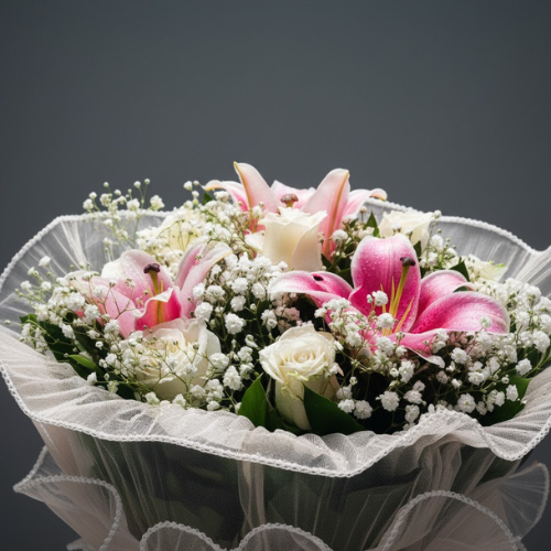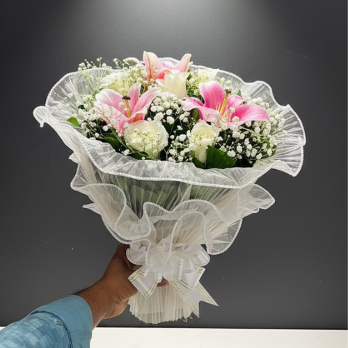 The Serene Luxury Bouquet: Pink Lily, White Rose & Baby's Breath